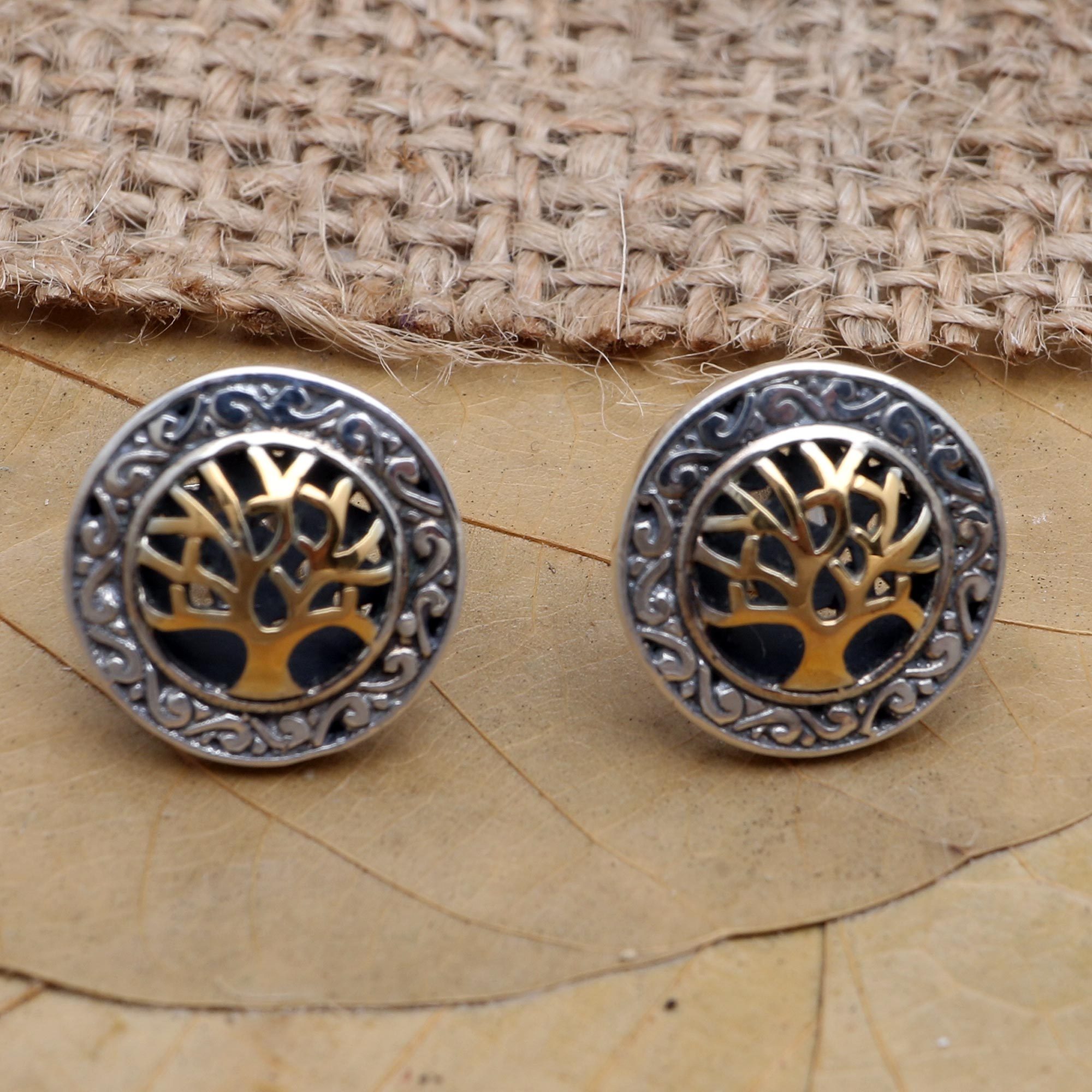 Luxurious gold and cool silver complement one another perfectly in this gorgeous pair of button earrings designed by Bali's Ari Gunawan. The artisan centers the round earrings with an 18 gold-plated sterling silver banyan, a fig tree native to India and Pakistan. A sterling silver frame surrounds the tree with oxidized designs.