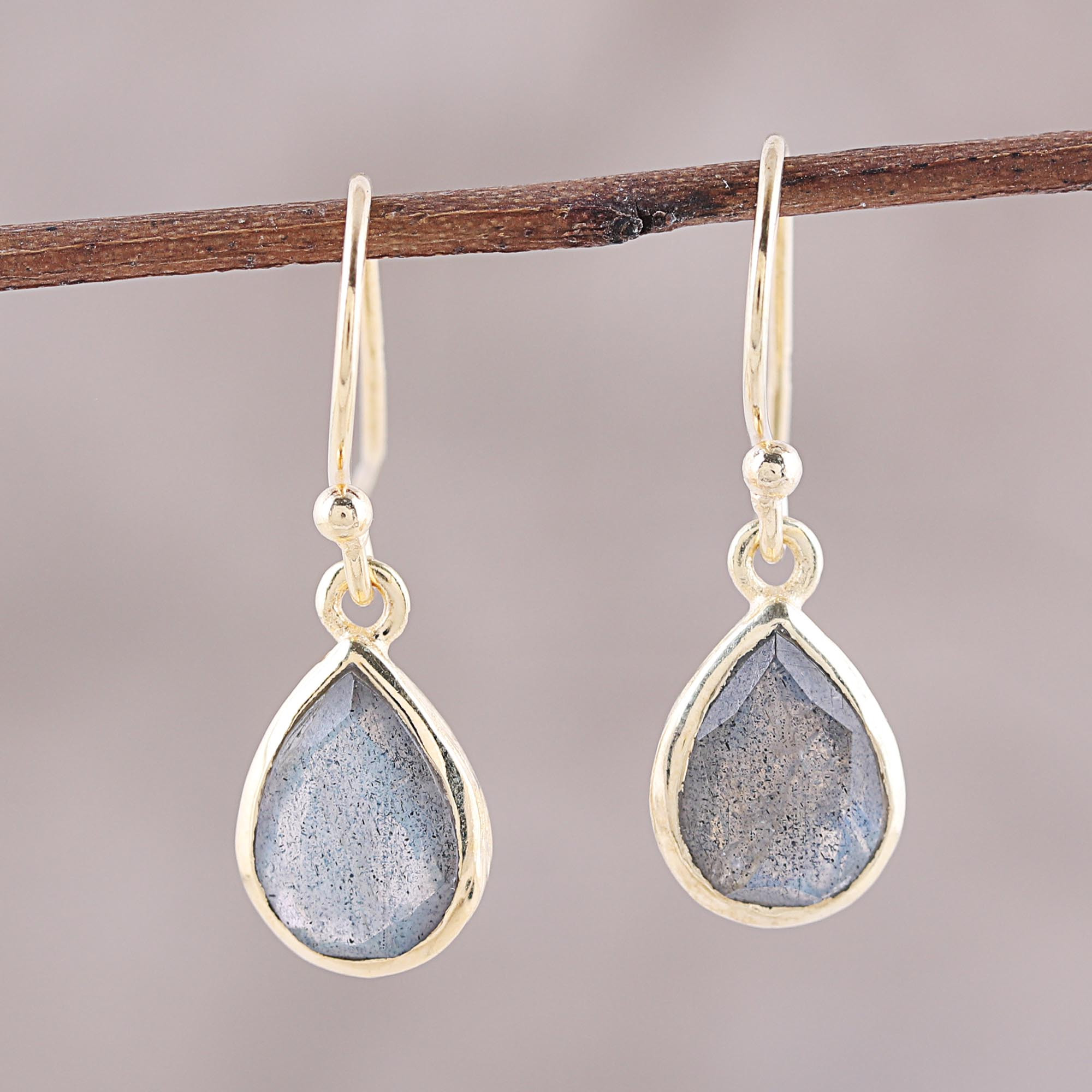 Framed in 18k gold plated sterling silver, two fantastic drops of labradorite total an impressive four carats in this pair of dangle earrings from India. Neetu Barathi designs this accessory, working with local artisans to craft it.