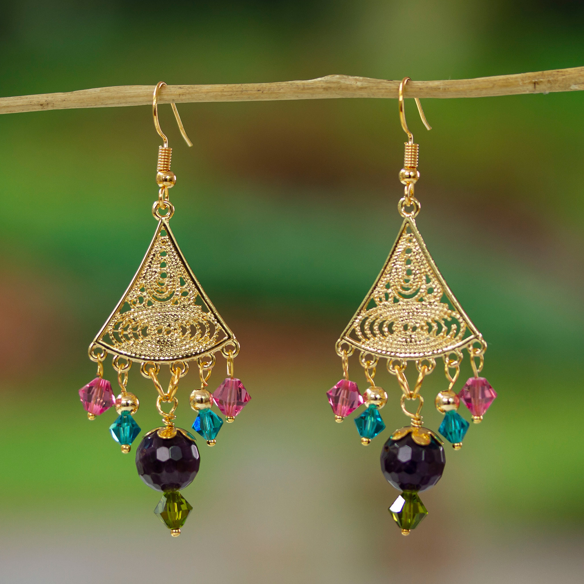 Lacy chandeliers are covered in gold and adorned withdeep purple agate globes. Faceted Swarovski crystalsin fuchsia, green and blue add decoration.