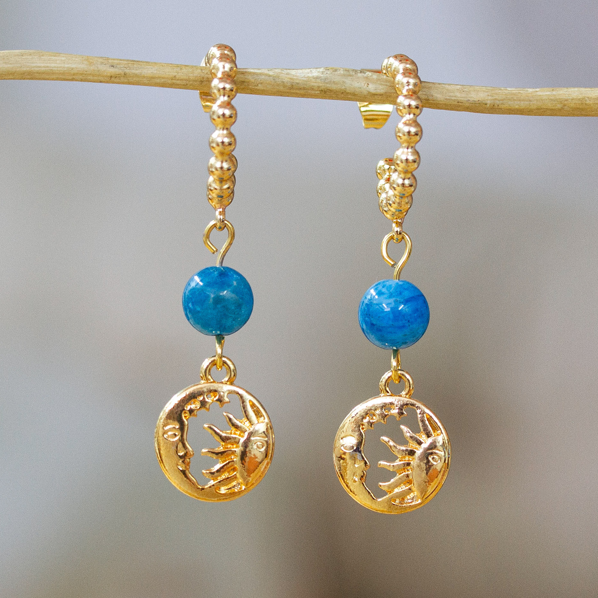 Light dances across polished gold-plated sun and moon accents, highlighting the vivid natural apatite stones that crown them. Mexican artisan Alejandra Aceves designs these statement earrings that are a standout addition to any jewelry collection.
