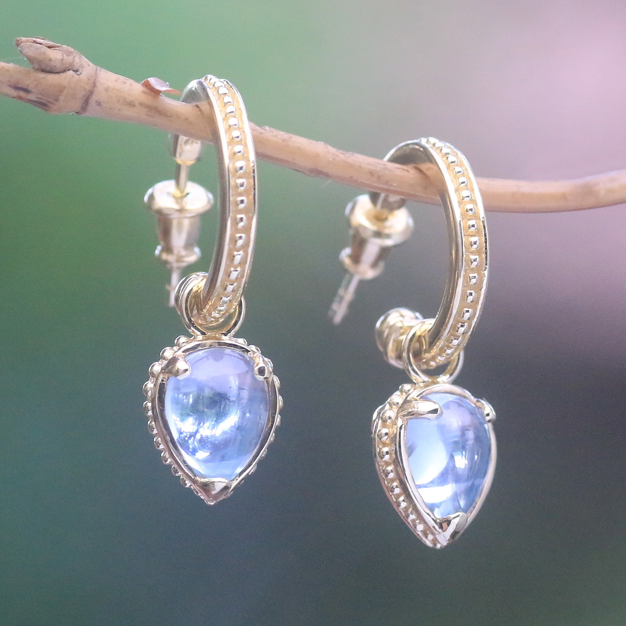 Gleaming beautifully, two blue topaz drops are featured in this pair of dangle earrings, from Bali. Zayd Makarim designs these earrings, crafted with half-hoops of 14k gold plated sterling silver.
