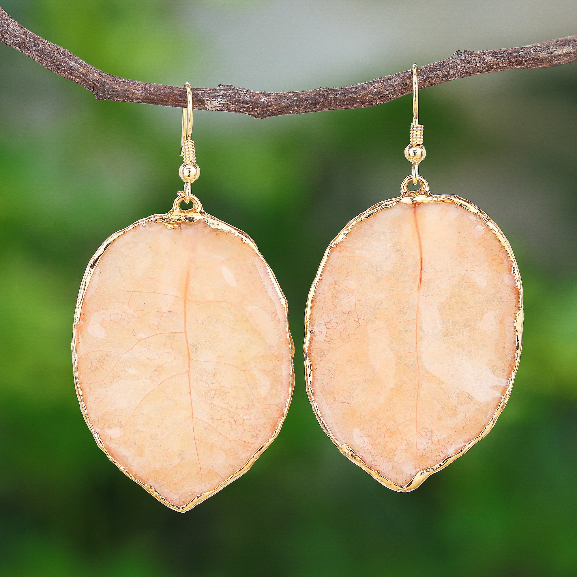 Presented by Danai in Thailand, these dreamy orange earrings are crafted from real bougainvillea petals. Thai artisans dye the petals a creamy orange color before coating them in a glossy lacquer and adding 22k gold-plated brass borders. Gold-plated brass hooks finish the necklace with a beautiful shine.