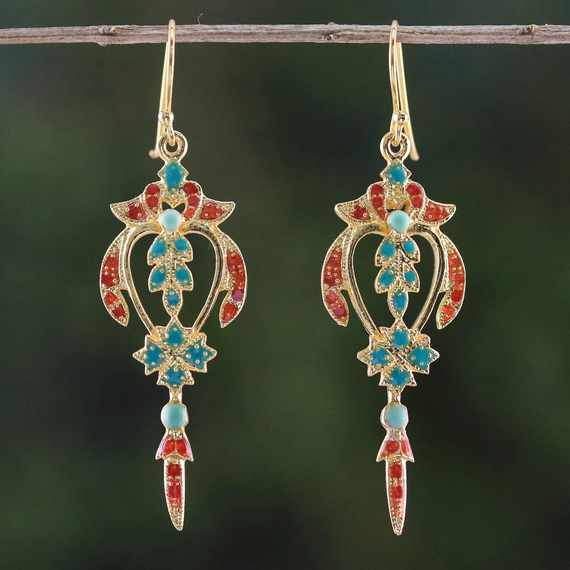 Elegant leafy motifs are crafted of brass bathed in 22k gold, designed by Thai artisan Matta. She accents these dangle earrings with enamel in colors of green and red for a truly beautiful accessory.
