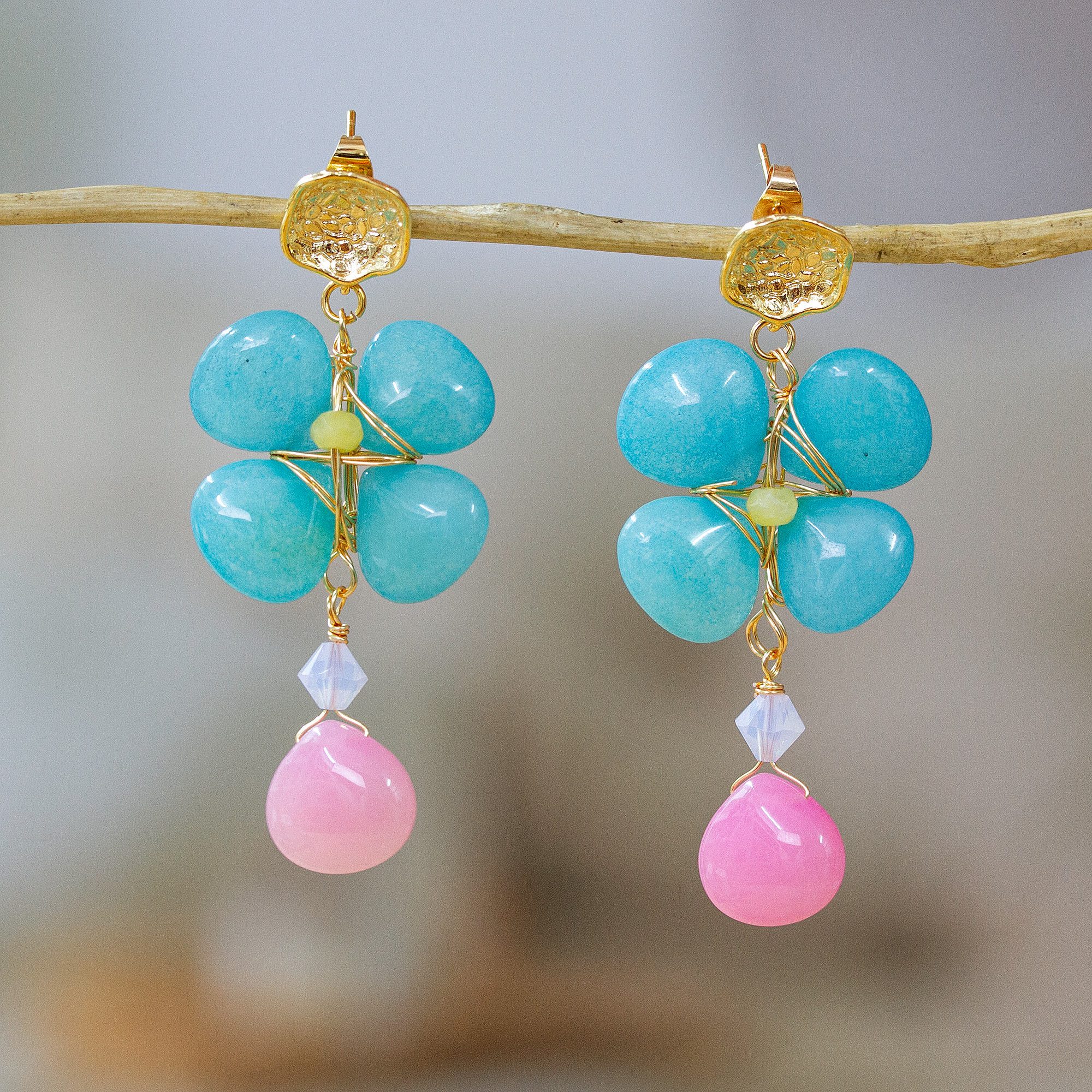 A brilliant mix of natural calcite stones and Swarovski crystals bursts to life in these 14k gold-plated floral earrings, where intricate wire work frames each gem like a vibrant treasure. Mexican artisan Alejandra Aceves brings movement and color to every detail, making this pair a striking companion for any occasion.
