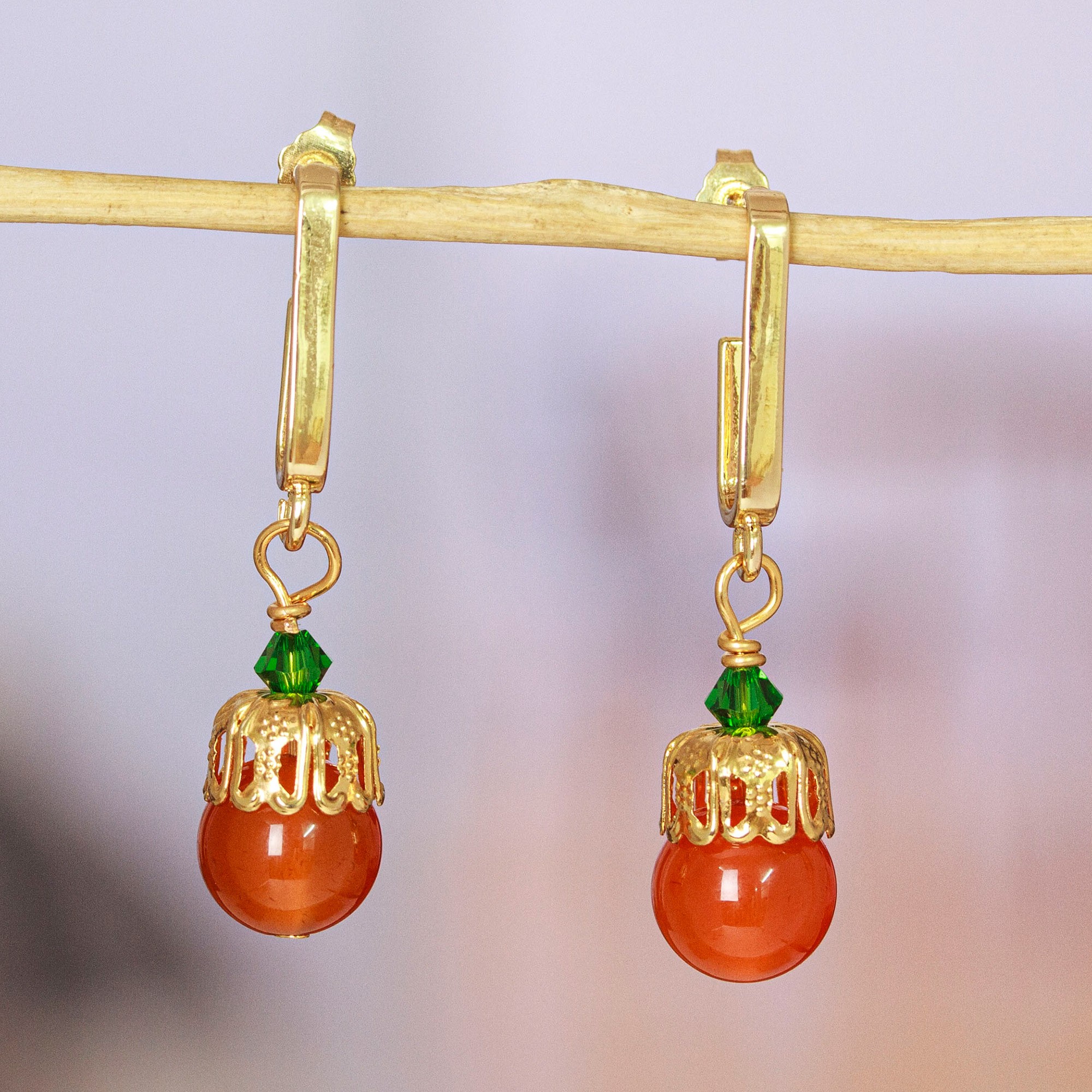 Mexican artisan Alejandra Aceves combines gorgeous jewels in a distinguished creation ideal to complement several ensembles. Ornamented with a high polish finish, these 14k gold-plated dangle earrings feature a luxurious, warm light in each detail. On top of that, natural carnelian beads and green Swarovski crystals complement the accessories' vibe, whose color combination allows for a glamorous look.