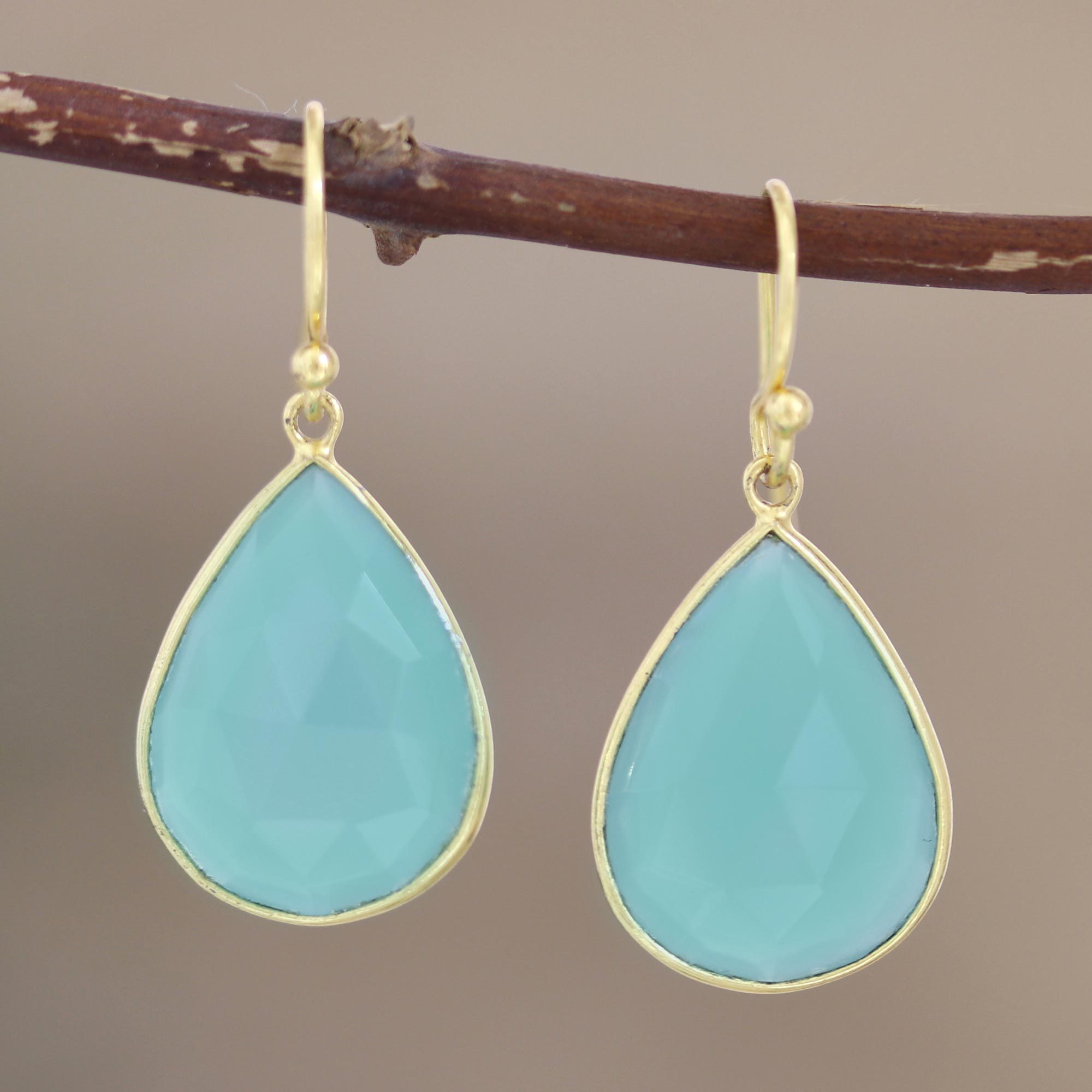 Neetu Barathi accents a cloudy blue-green stone with shimmering gold to create these lovely dangle earrings. Indian artisans center each earring with a faceted chalcedony stone in a bezel setting, accenting the stone with 18k gold-plated sterling silver hooks.