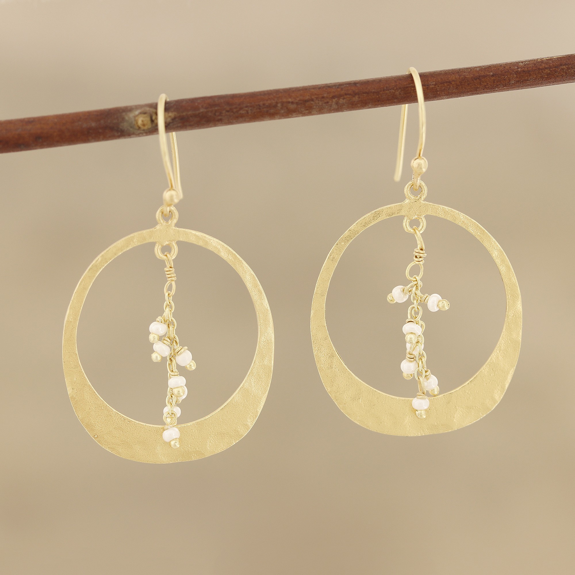 Descending like rain, petite cultured pearls dangle within open circles. Indian designer Vivek Nathany offers these earrings, which are crafted from 22k gold plated sterling silver, given a hammered finish that captures the light with elegance.