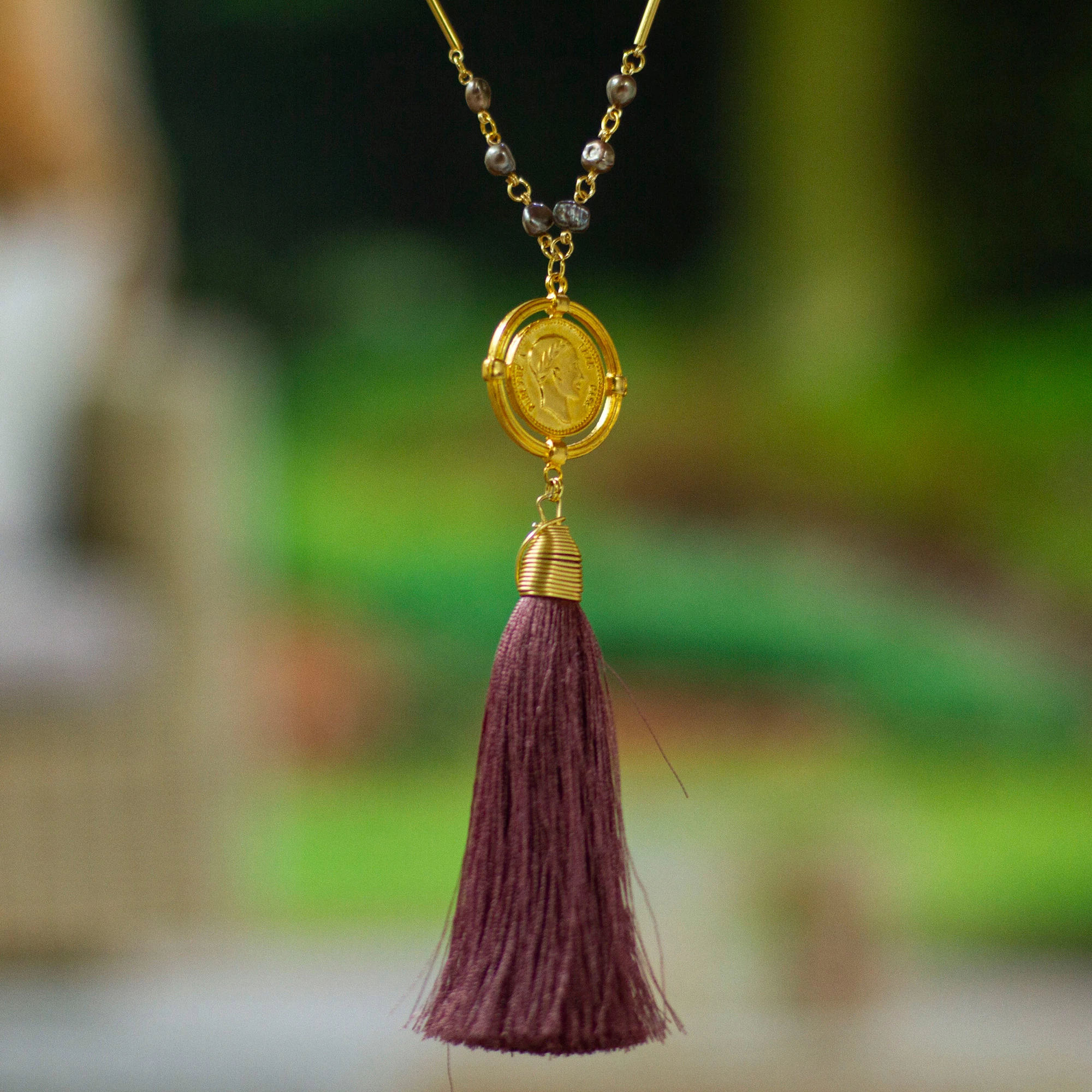 You'll never look more glamorous than wearing this splendid long Y necklace, a striking statement piece designed by Mexican artisan Ali Guzman. Fashioned from radiant 24k gold-plated brass and embellished with elegant grey cultured pearls, this alluring accessory doesn't stop at just that – it boasts a gorgeous Roman coin accent gracing a delicate dusty rose tassel, ensuring you radiate sophistication and captivate all eyes.