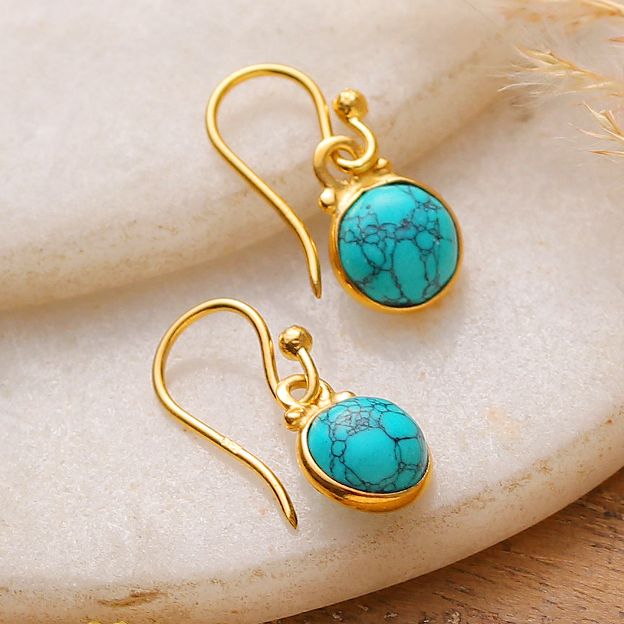 These eye-catching dangle earrings showcase twin pools of sky blue reconstituted turquoise, their smooth cabochon surfaces creating a serene focal point that draws the eye with quiet confidence. The rich contrast between the cool blue stones and their warm gold-plated silver settings creates a visual harmony that feels both timeless and refreshingly vibrant. Bhavya Jain of India creates these radiant accessories, ready to bring color to any ensemble.