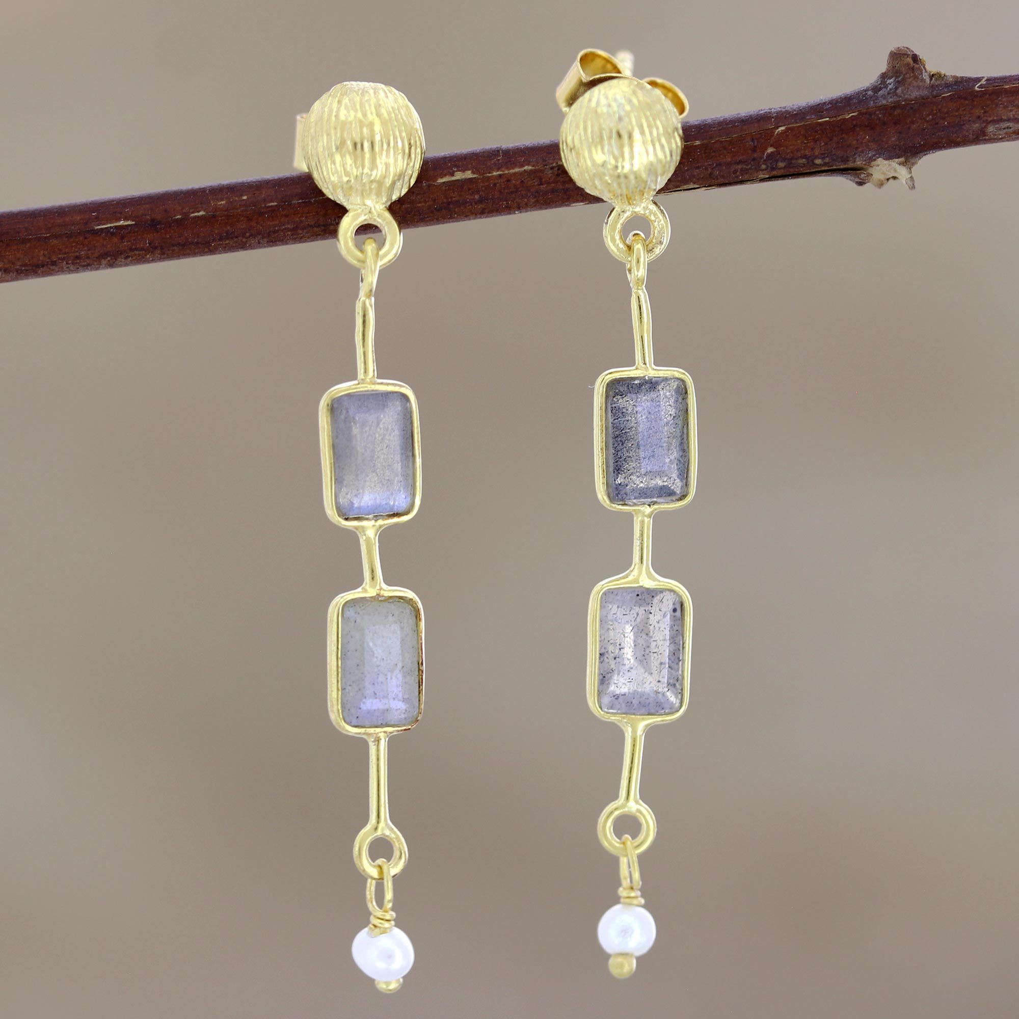 Gold-Plated Labradorite and Pearl Dangle Earrings, 'New Year'