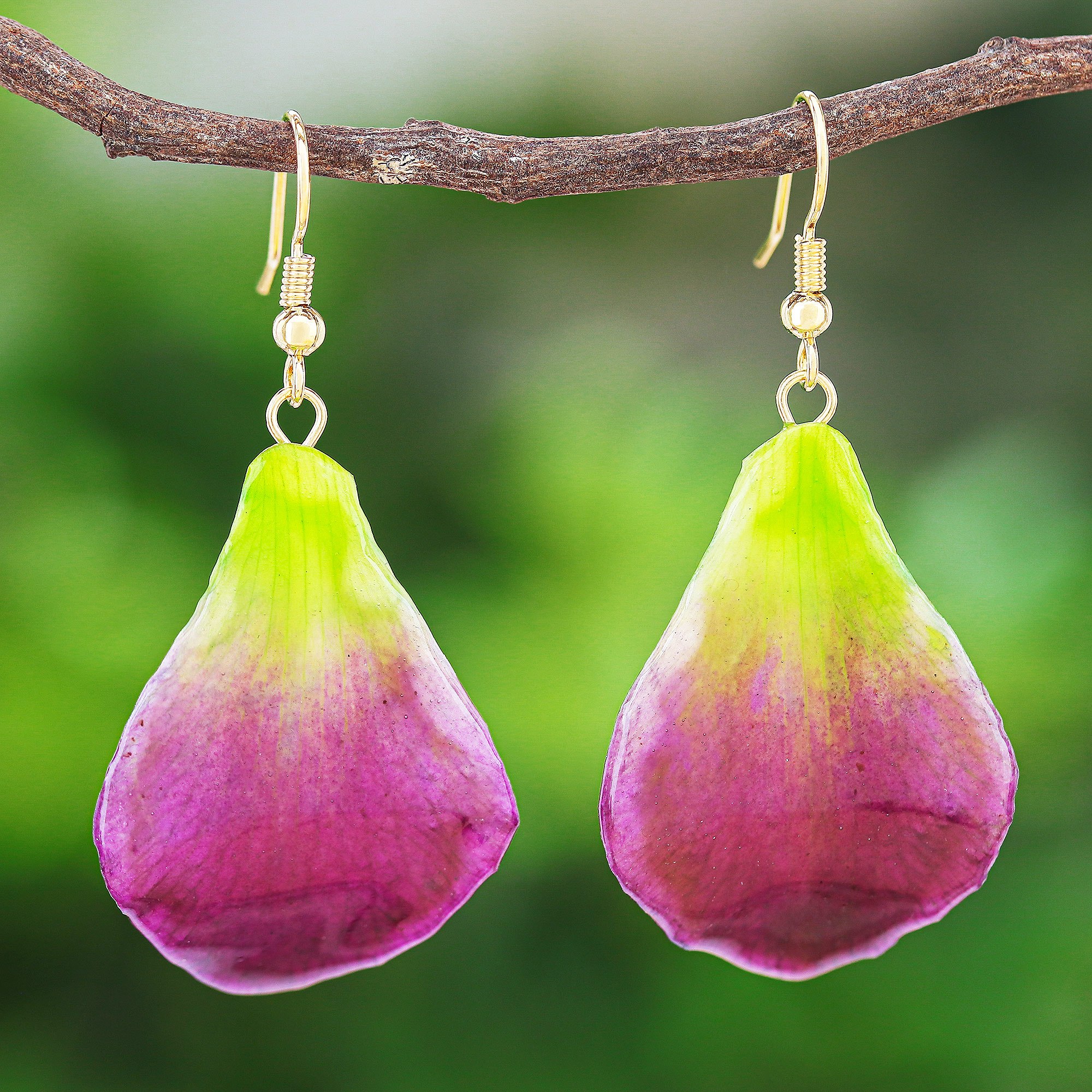 Presented by Danai in Thailand, these two-toned earrings are sure to attract compliments. Thai artisans cut real orchid petals into drop shapes before dying and coating them with a glossy resin. 22k gold-plated brass hooks add a beautiful shimmer to the pair.