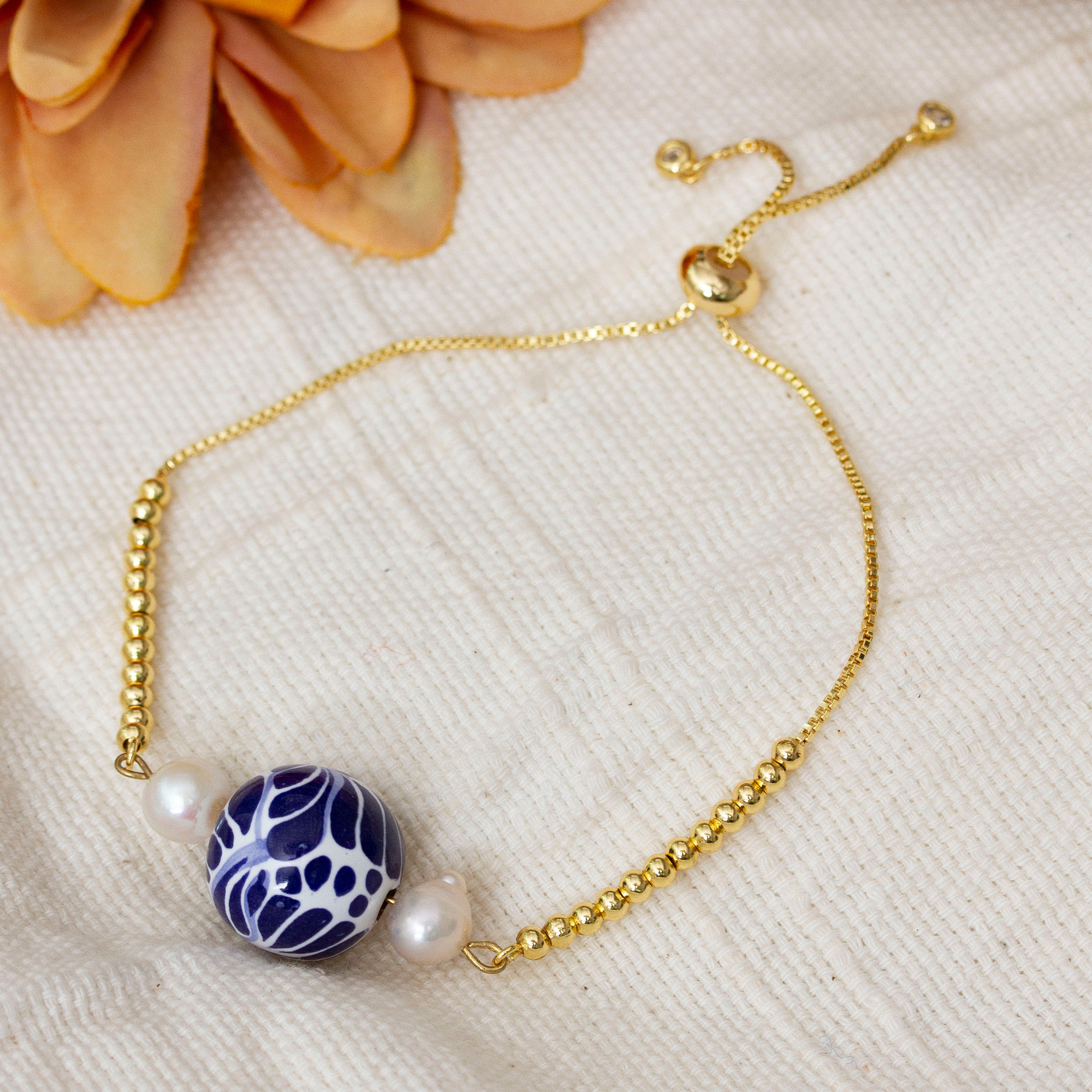 Cultured pearls unite with the timeless elegance of the Talavera art style, creating this dazzling pendant bracelet. Mexican artisan Monica Vazquez bathes the piece in 10k gold plating and polishes every detail to enrich the design's cream and blue hues.