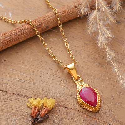 Gold-Plated Pendant Necklace with 3-Carat Drop-Shaped Ruby, 'Shiny Pink Rain'