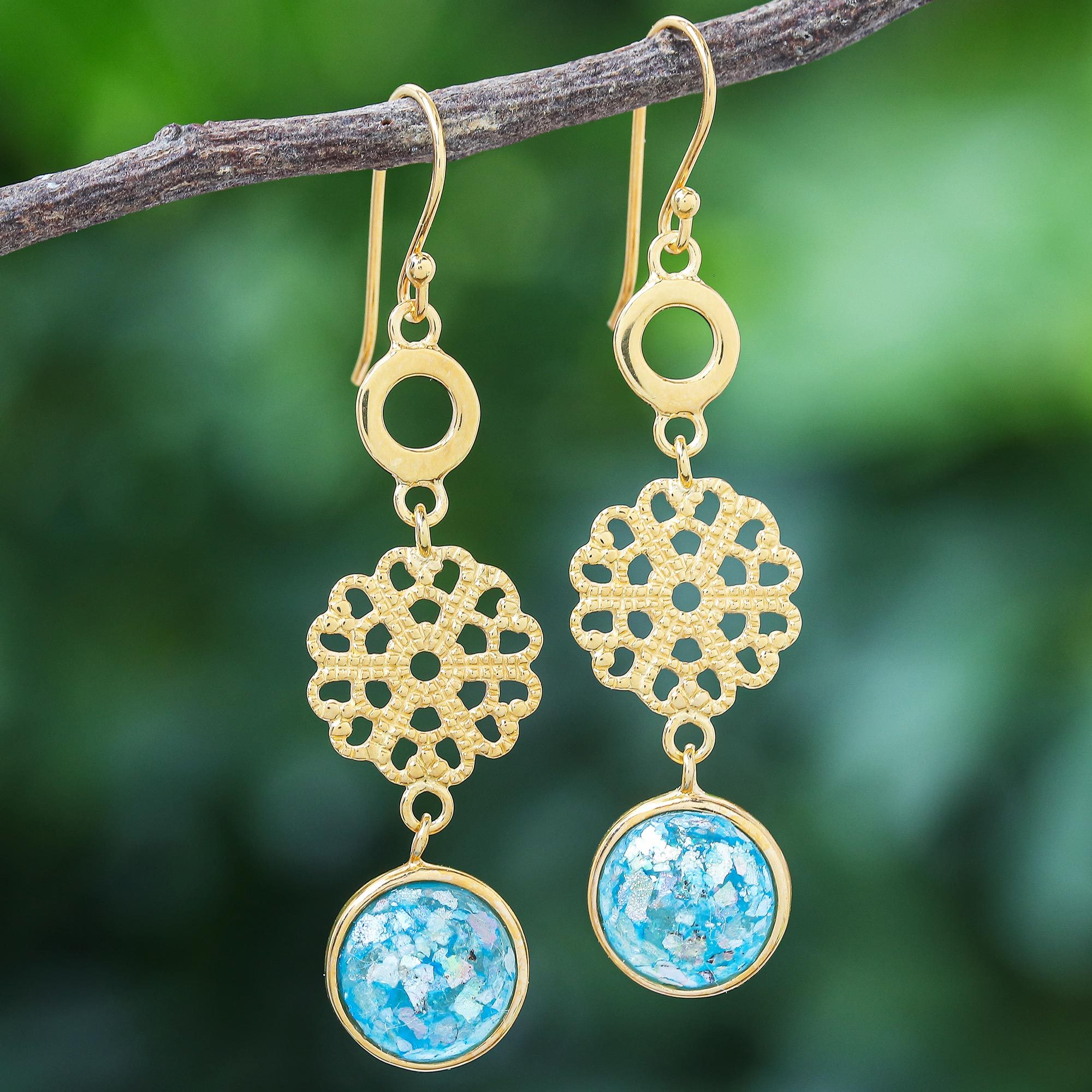 Gold-Plated Roman Glass Dangle Earrings, 'Underground Waterfall'