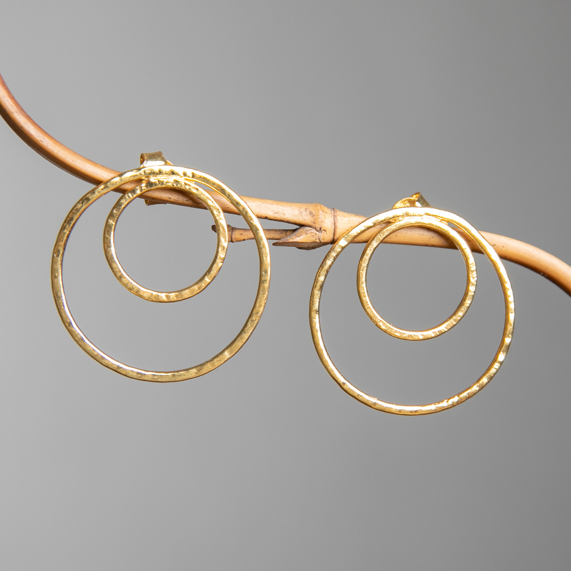 Playful yet polished, these double-circle drop earrings are a study in celestial geometry. Designed by Bali's Dhea Pramesthi, each earring features concentric hoops in lustrous 18k gold-plated silver, brought to life with a delicate hammered finish that catches and reflects light like sun dancing on water. The artisan texture adds depth and movement to the sleek circular silhouette, creating a look that's simultaneously modern and timelessly elegant. Perfect for those who love statement earrings with substance, these drops swing gracefully with every turn of your head, bringing a touch of golden radiance and artistic sophistication to everything from sundresses to evening wear.