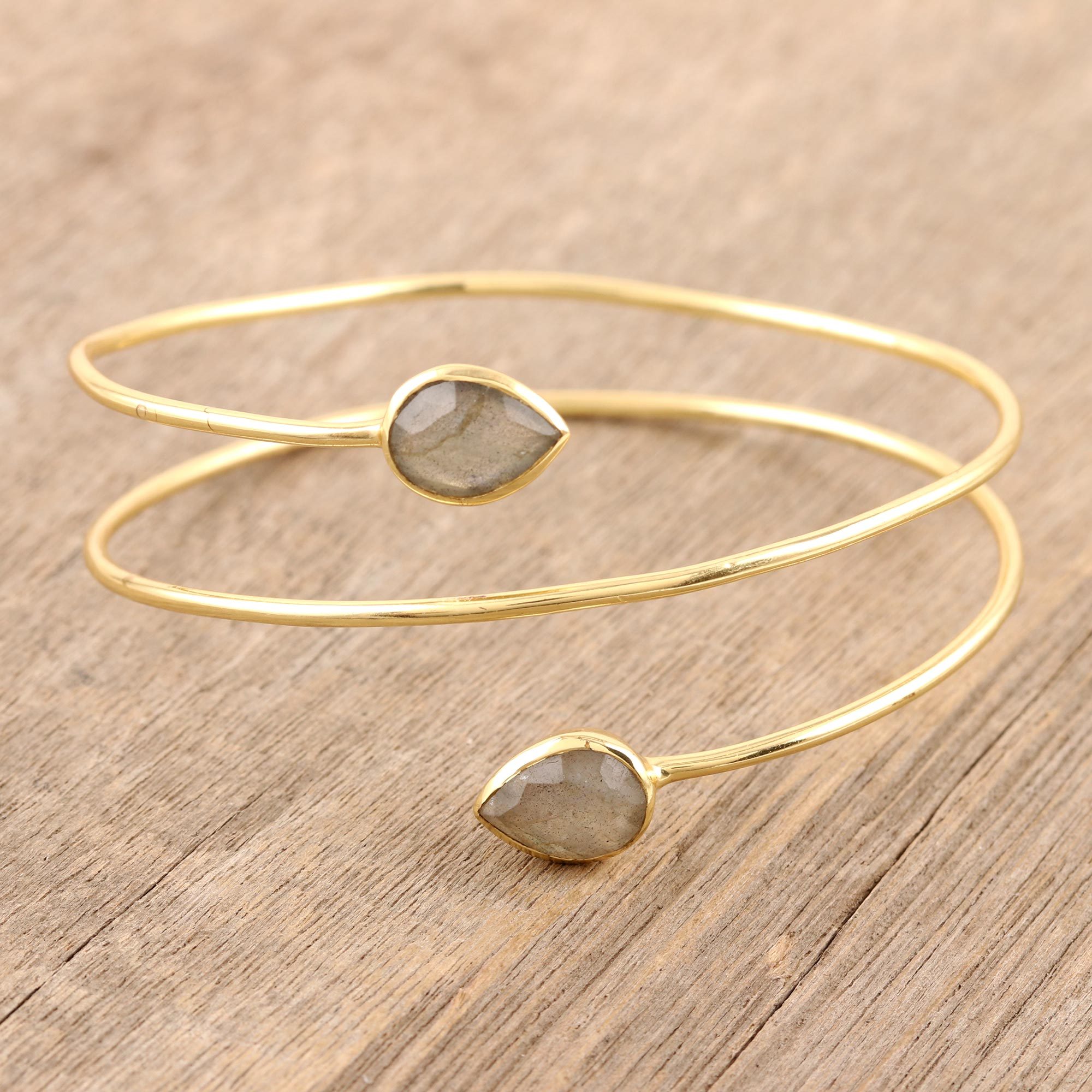 Two labradorite teardrops bookend this elegant twist on the classic cuff bracelet. Indian artisan Neetu Barathi crafts the bracelet from a coil of 18k gold-plated sterling silver, then completes the cuff with two labradorite gemstones in bezel settings.