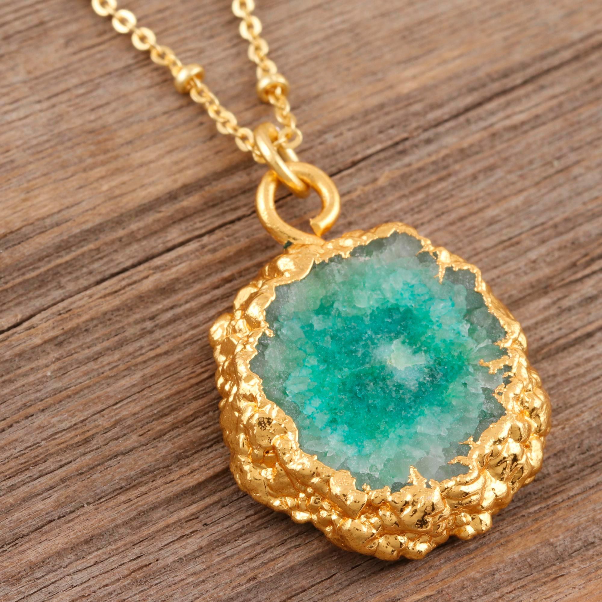 Get lost in the mystical power of this enigmatic necklace designed by India's Vivek Nathany. A crystalline blue solar quartz gemstone peeks out from a hand crafted 22k gold-plated sterling silver pendant, which swings from a sleek gold-plated rolo chain.