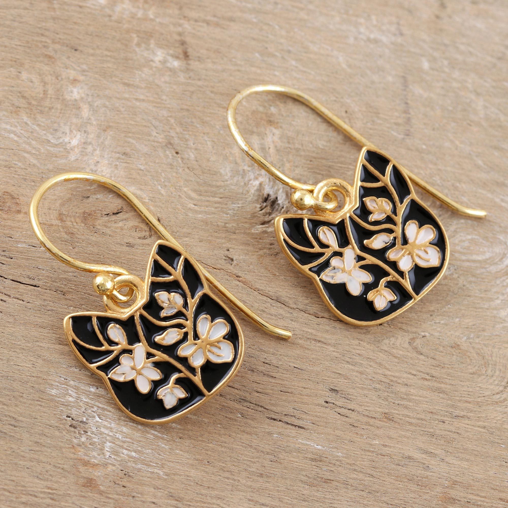 Designed by Sapna Mehta, these adorable dangle earrings are a cat lover's dream come true. Indian artisans craft the kitty cat-shaped earrings from 24 gold-plated sterling silver, using glossy enamel to paint a pretty black and white floral motif that perfectly complements the shimmering gold.