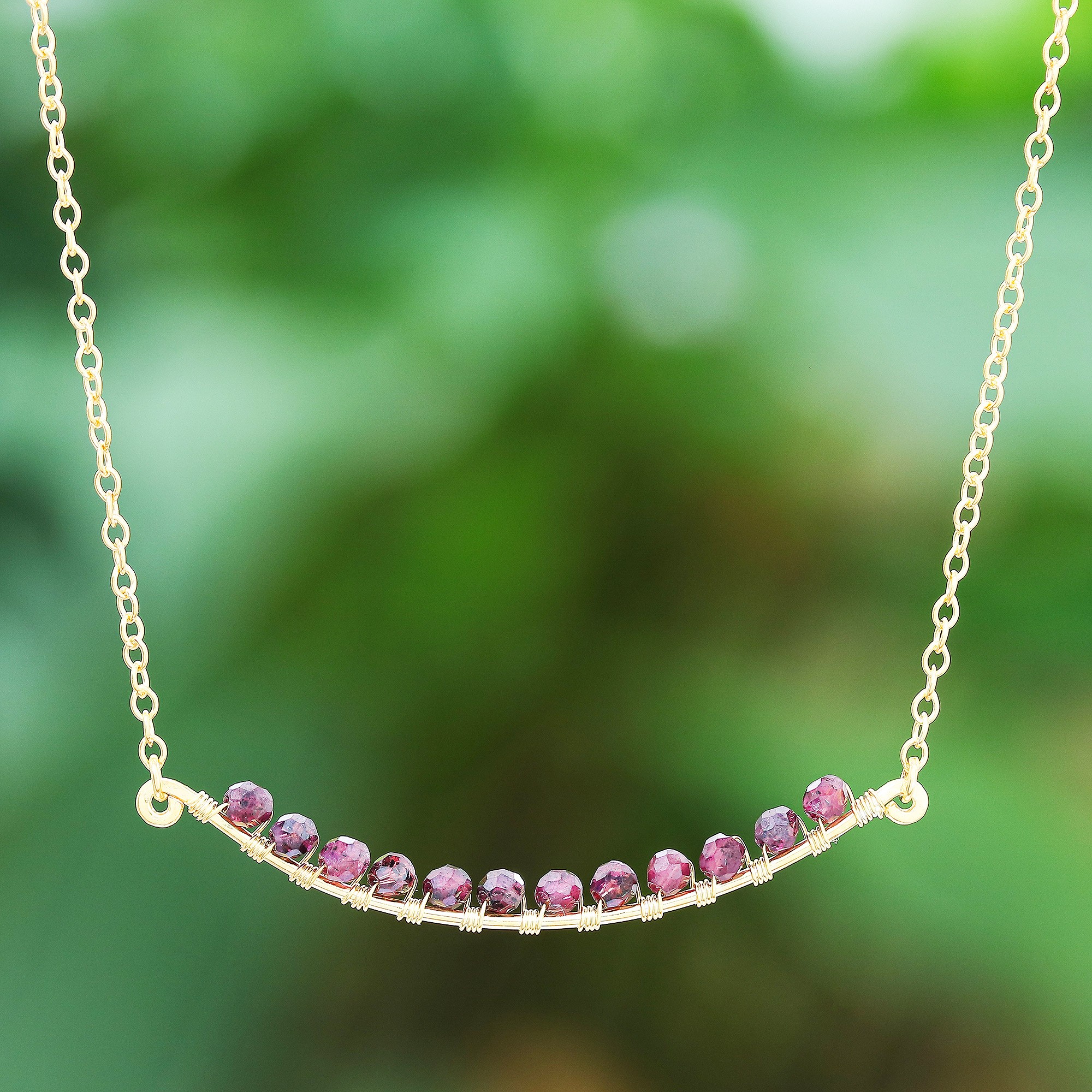 A delicate twig of 24-karat gold-plated sterling silver is suspended from a cable chain in this necklace designed and crafted by Somsiri Juntamin of Thailand. Perched along the gentle arc are 12 natural faceted garnet beads, and a 13th garnet adorns the end of the extender chain.