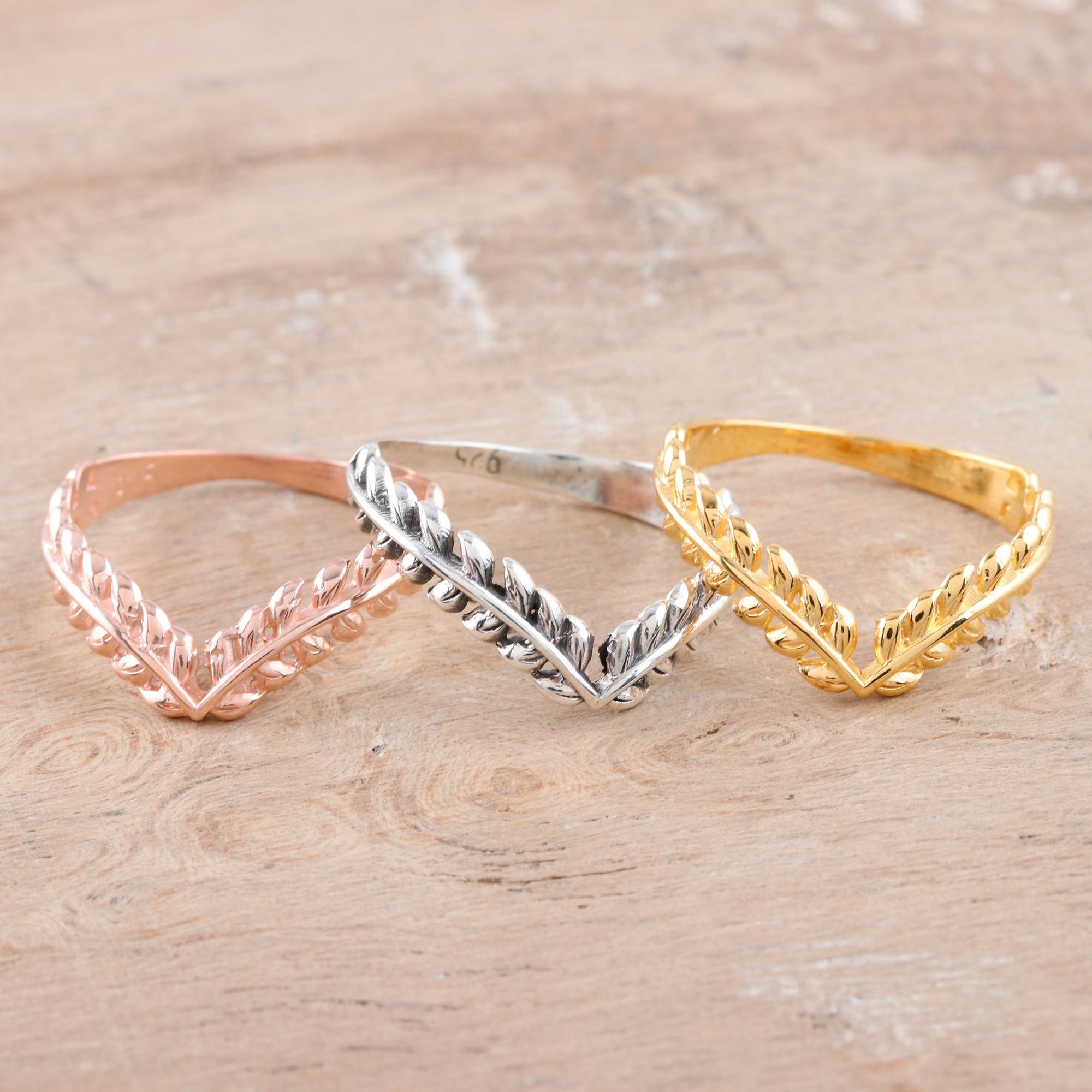 This trio of delicate leaf motif rings can be worn together or separately and sport a design reminiscent of a laurel wreath. Indian artisan Bhavya Jain crafts the rings in 925 sterling silver, then applies 18k yellow gold plate to one and rose gold plating to another--leaving the third in its original lustrous silver finish.