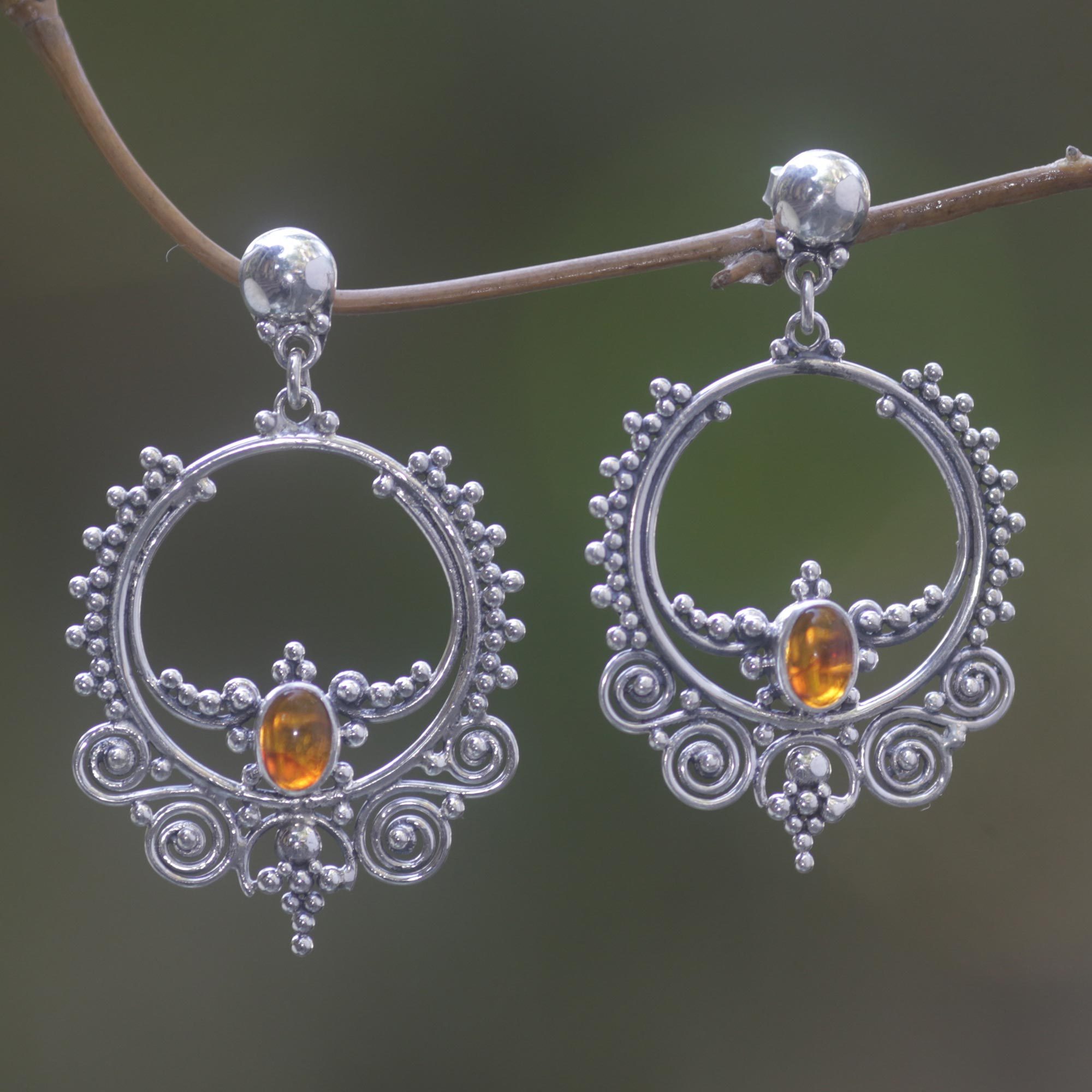 These unique dangle earrings combine the classic sterling silver woven in an intricate pattern, with a splash of Amber to spice things up. Amber is a beautiful material that has many tones from yellow to dark orange, and even a green cast. A piece crafted by Sukartini, this is as timeless as the amber itself.