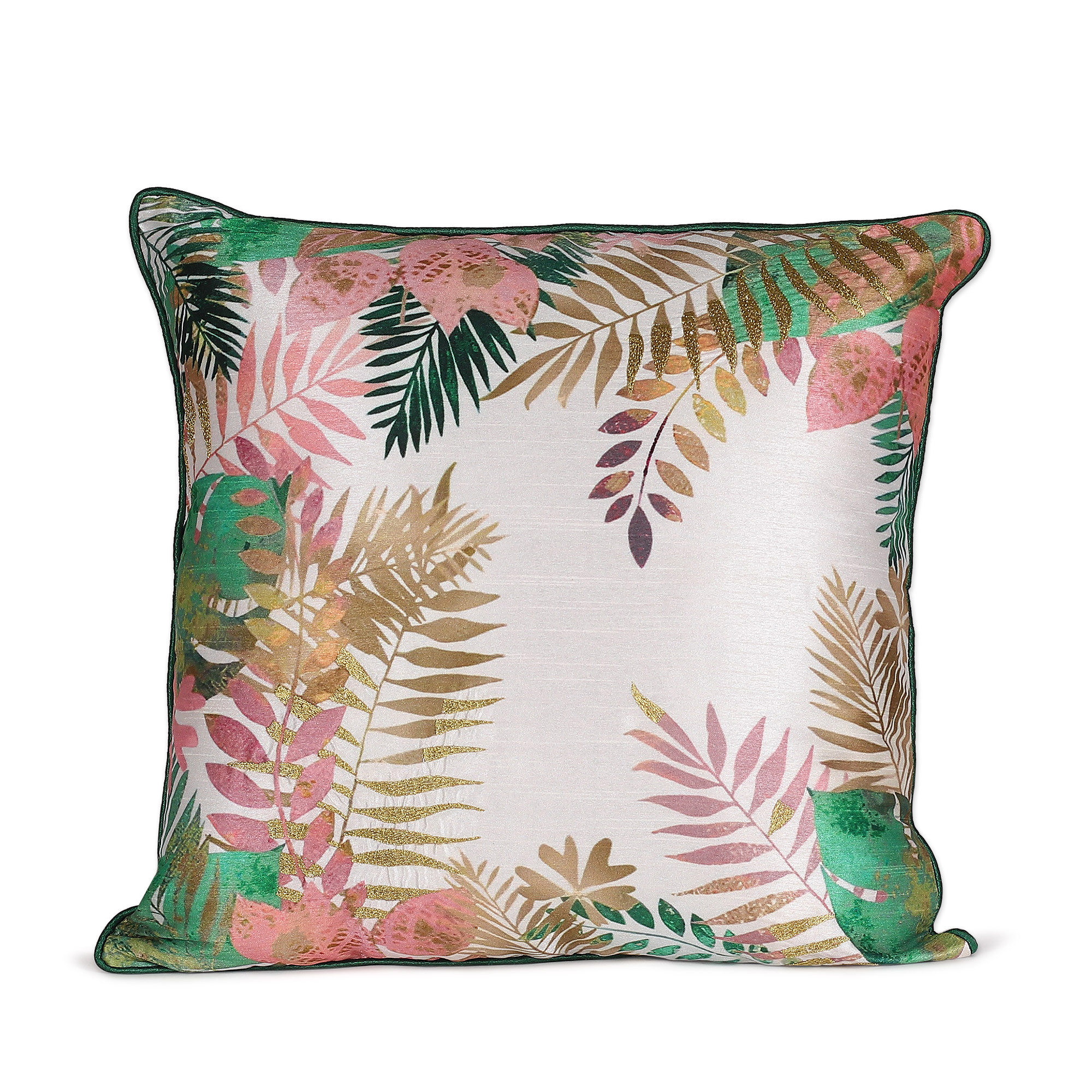 The Indian forest lets a tender whisper of beauty decorate this pair of cushion covers—crafted by Seema's talented artisan team. A leafy print and green piping decorate the design's ivory base hue, whereas golden zari embroidery adds a radiant touch. To allow for practical use, a zipper completes the back.