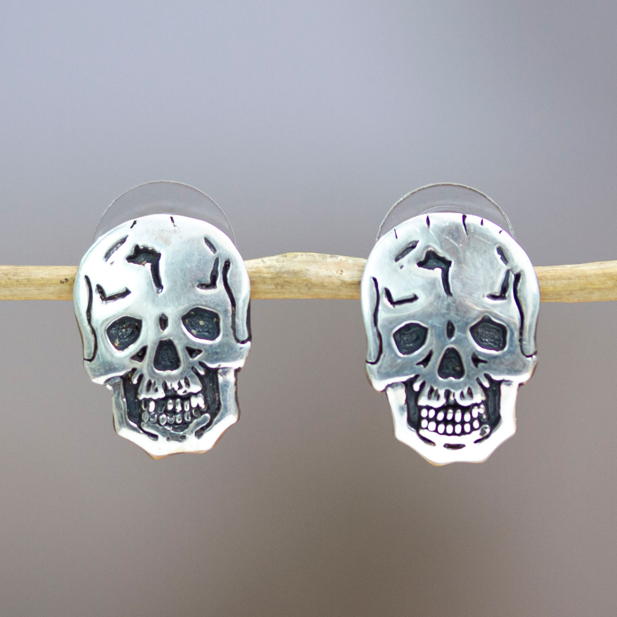 Gothic-Inspired Skull-Themed Sterling Silver Button Earrings, 'Underworld Façade'