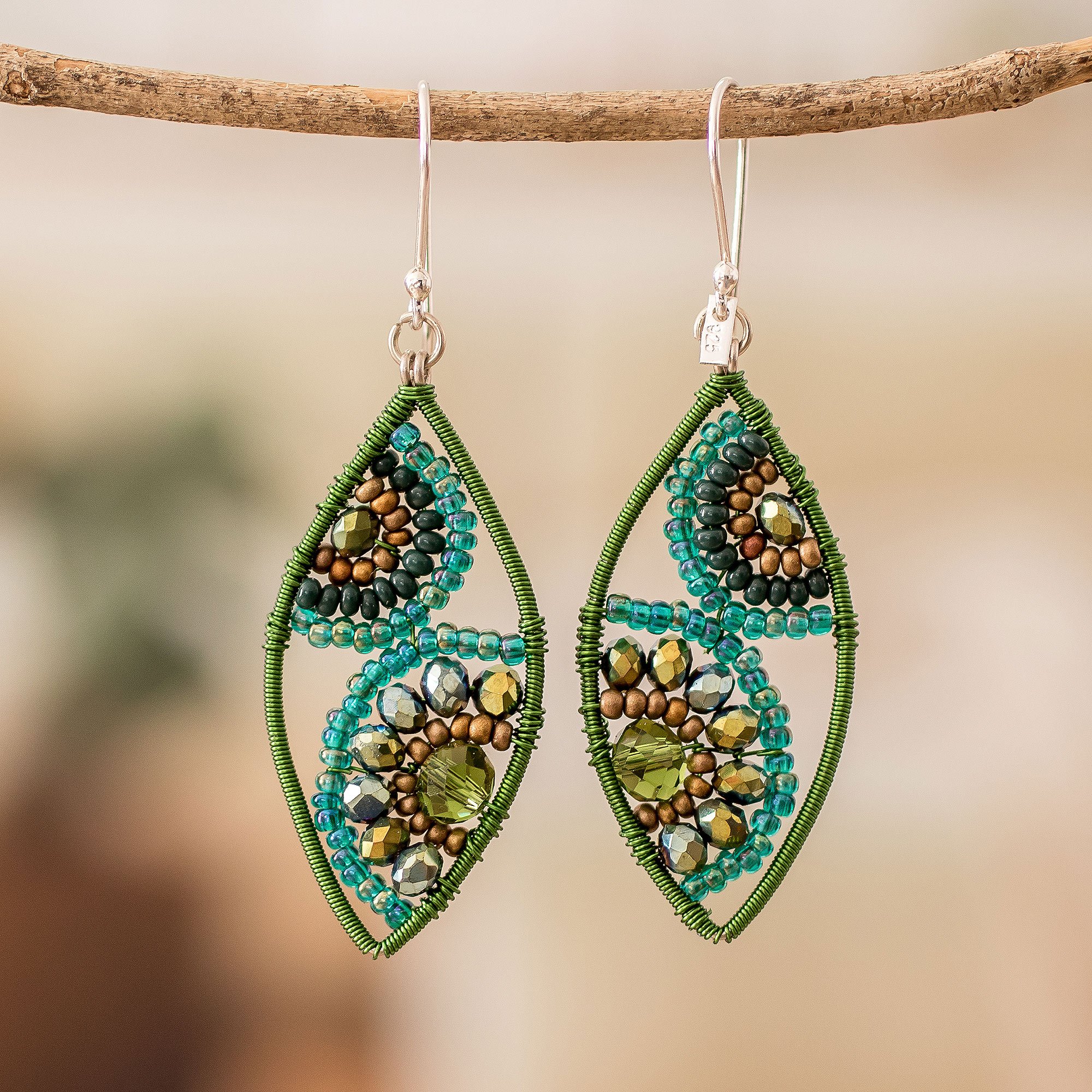 Leaf-shaped dangle earrings show the exquisite talent of Guatamala's Domingo Reanda. The artisan works with stainless steel to create these nature-inspired accessories, whose green and turquoise crystals and glass beads shine with a refreshing vibe. As the final touch, Domingo adds handy sterling silver hooks.