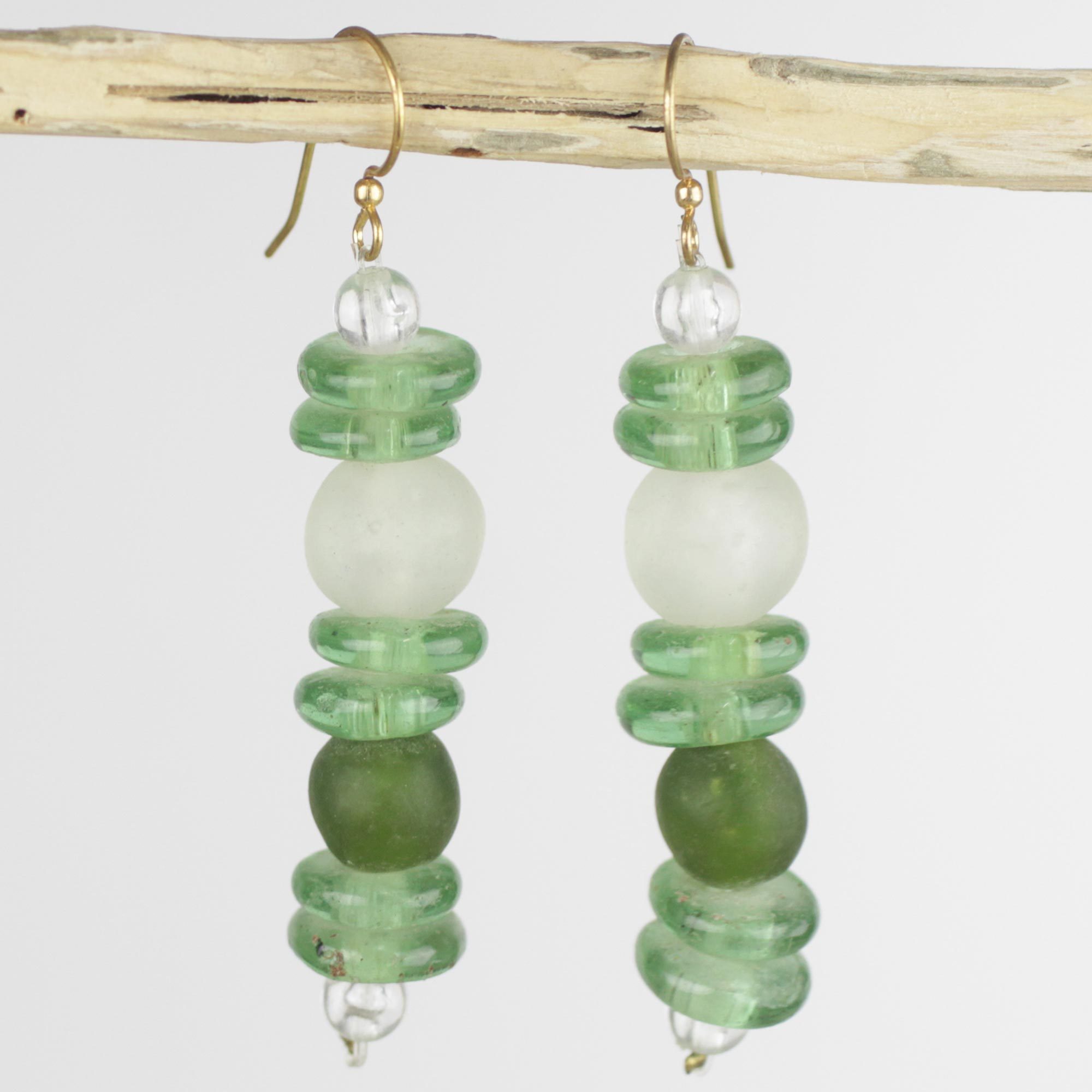 Rita Addo Zakour's "Dziedzorm" earrings are designed to accessorize with Ghanaian elegance. Meaning "I am glad" in Ewe, the earrings are crafted by hand with green beads crafted of recycled glass and recycled plastic.