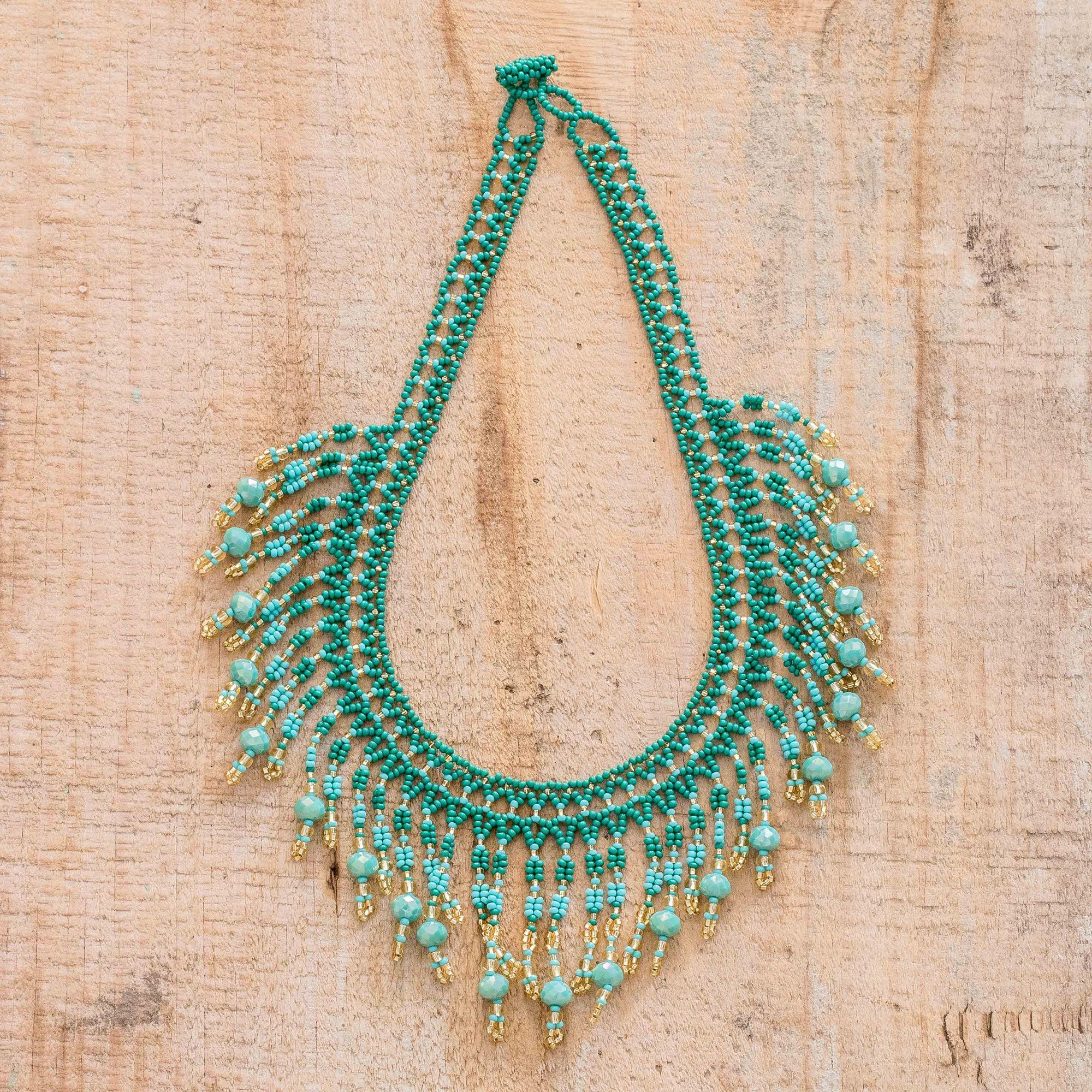 This dramatic beaded waterfall necklace is the original creation of Mirian Zet in Guatemala. The artisan strings viridian, aqua and gold crystal and glass beads in elaborate patterns to create the necklace, which is secured by a beaded toggle clasp.