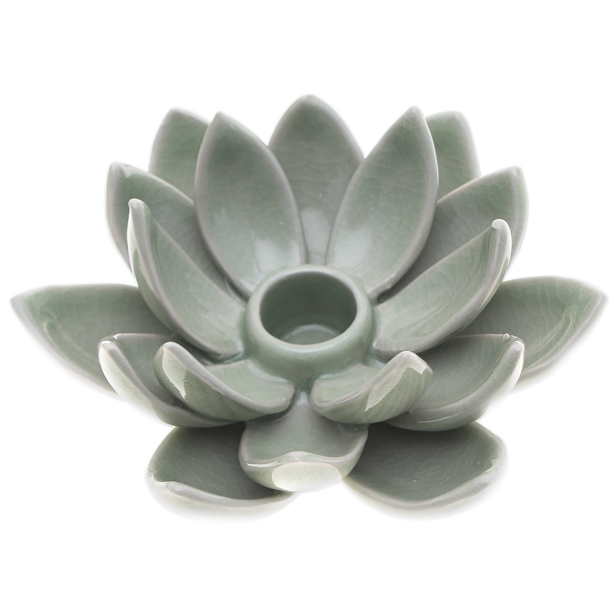 Impress your guests with the charm and elegance this celadon ceramic candle holder brings to your table. Designed by Thai artisan Penpan, the gorgeous holder blooms with splendor thanks to its graceful lotus flower shape and fascinating crackled green glaze. Ready to hold a taper candle, it casts a warm glow over your elegant soirées.