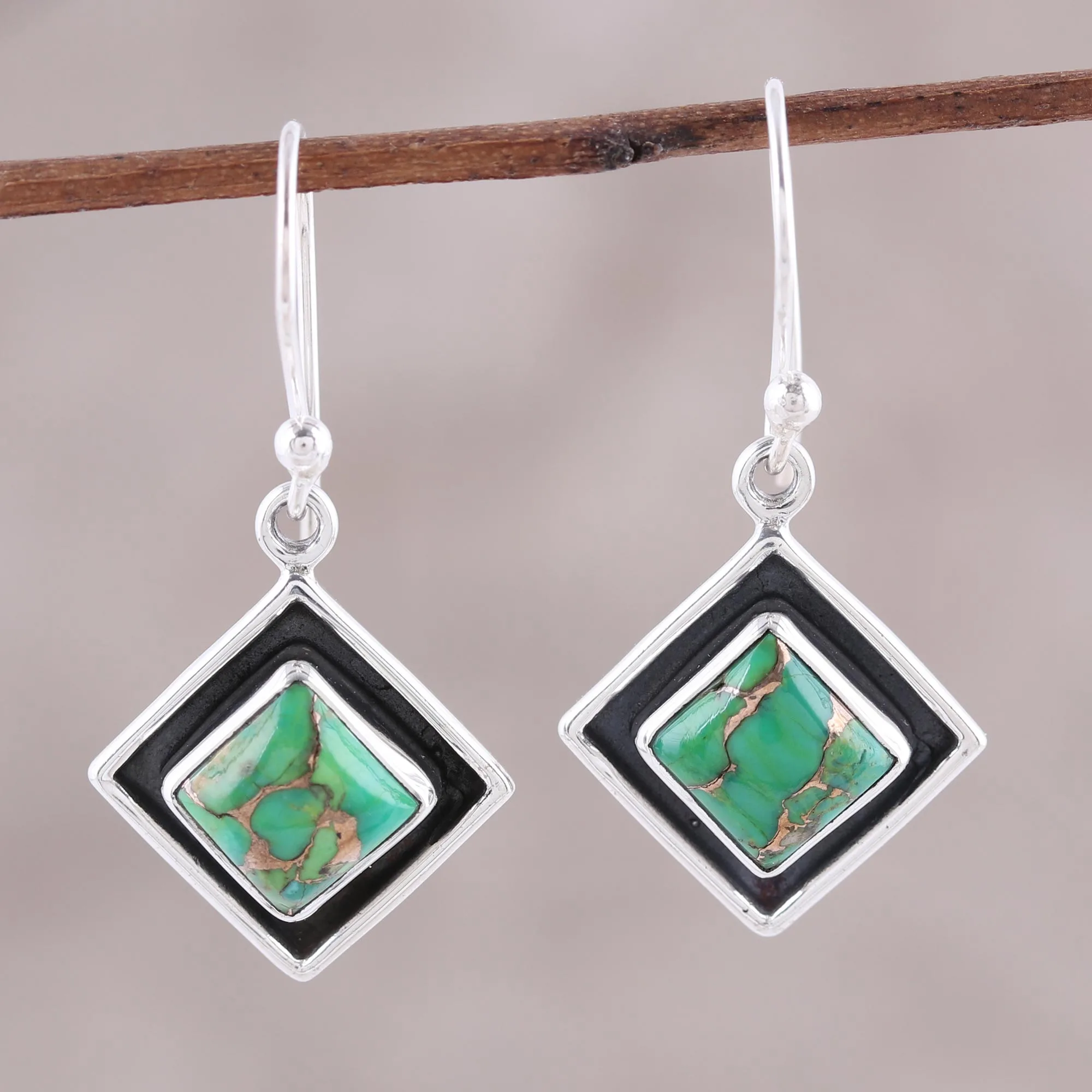 Presented by Shanker, these Indian earrings resemble chic kites that dangle from the ears. Each square earring is crafted of sterling silver with a combination of finishes, centered by a piece of green composite turquoise that gleams with golden veins.