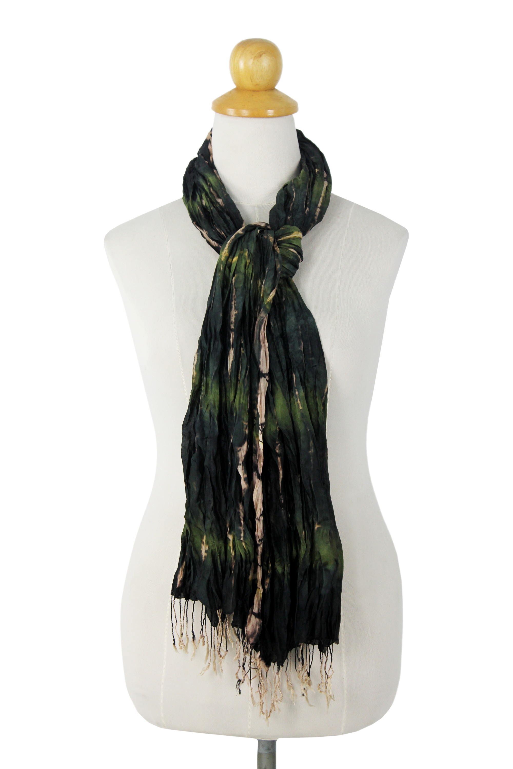 The crinkled textures of Thai silk are transformed into a scarf of exotic elegance. Presented by Vinita, the dark green scarf with cream patterns is hand crafted with tie-dye techniques.