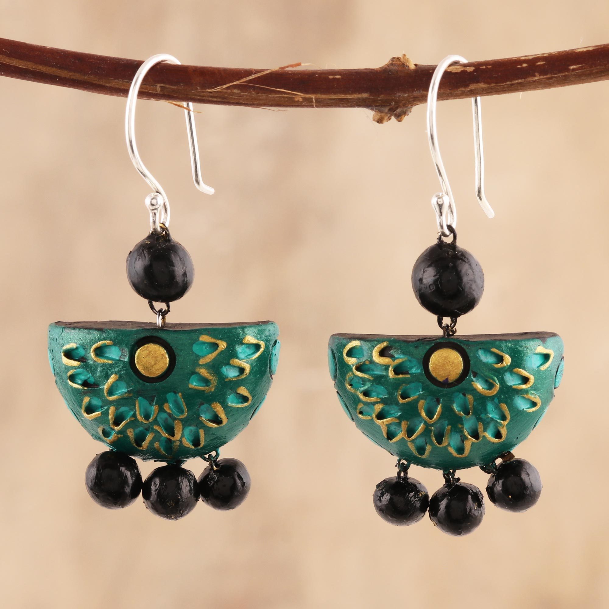 Handcrafted from ceramic, two half-circles displaying orchid patterns are painted by hand in metallic green. Ritu Thapar designs these Bollywood-style dangle earrings, which are completed with black baubles. Each earring swings from a hook of sterling silver.
