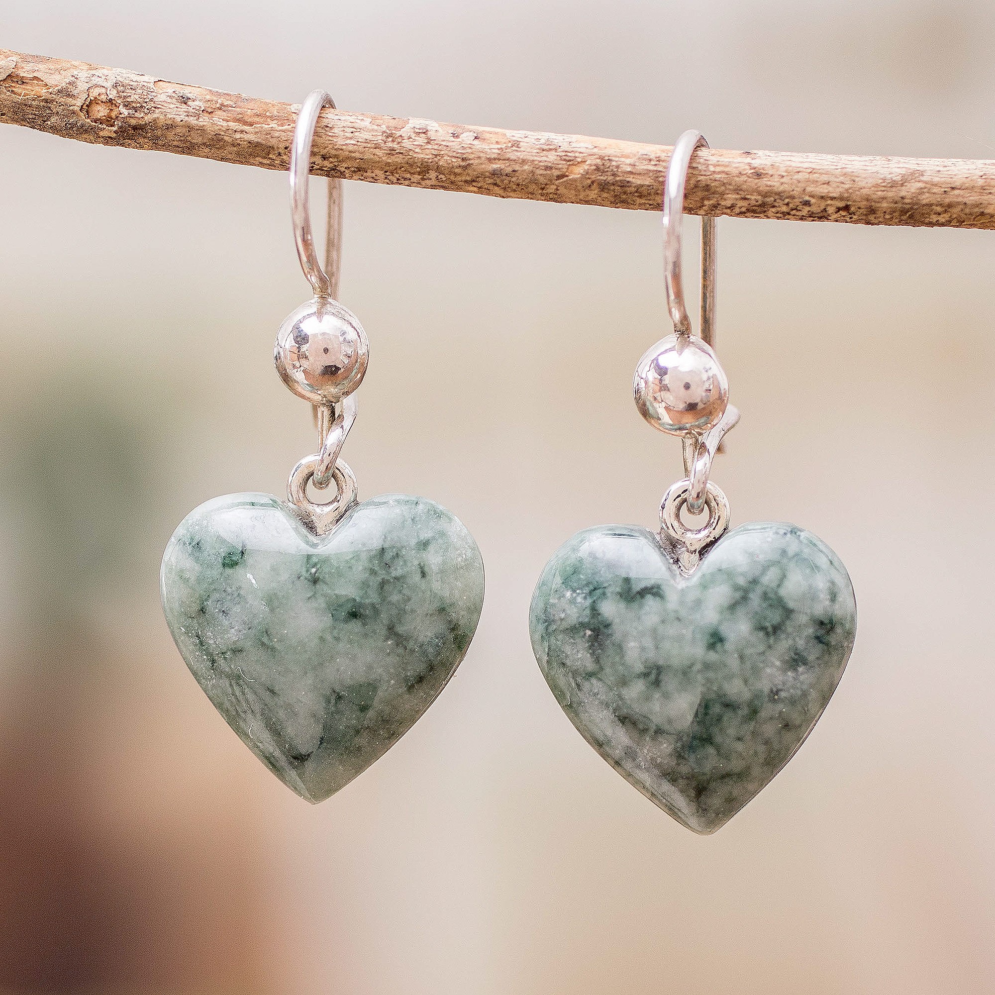 Green Heart Shaped Jade Silver Dangle Earrings Guatemala, 'Mayan Heart in Green'
