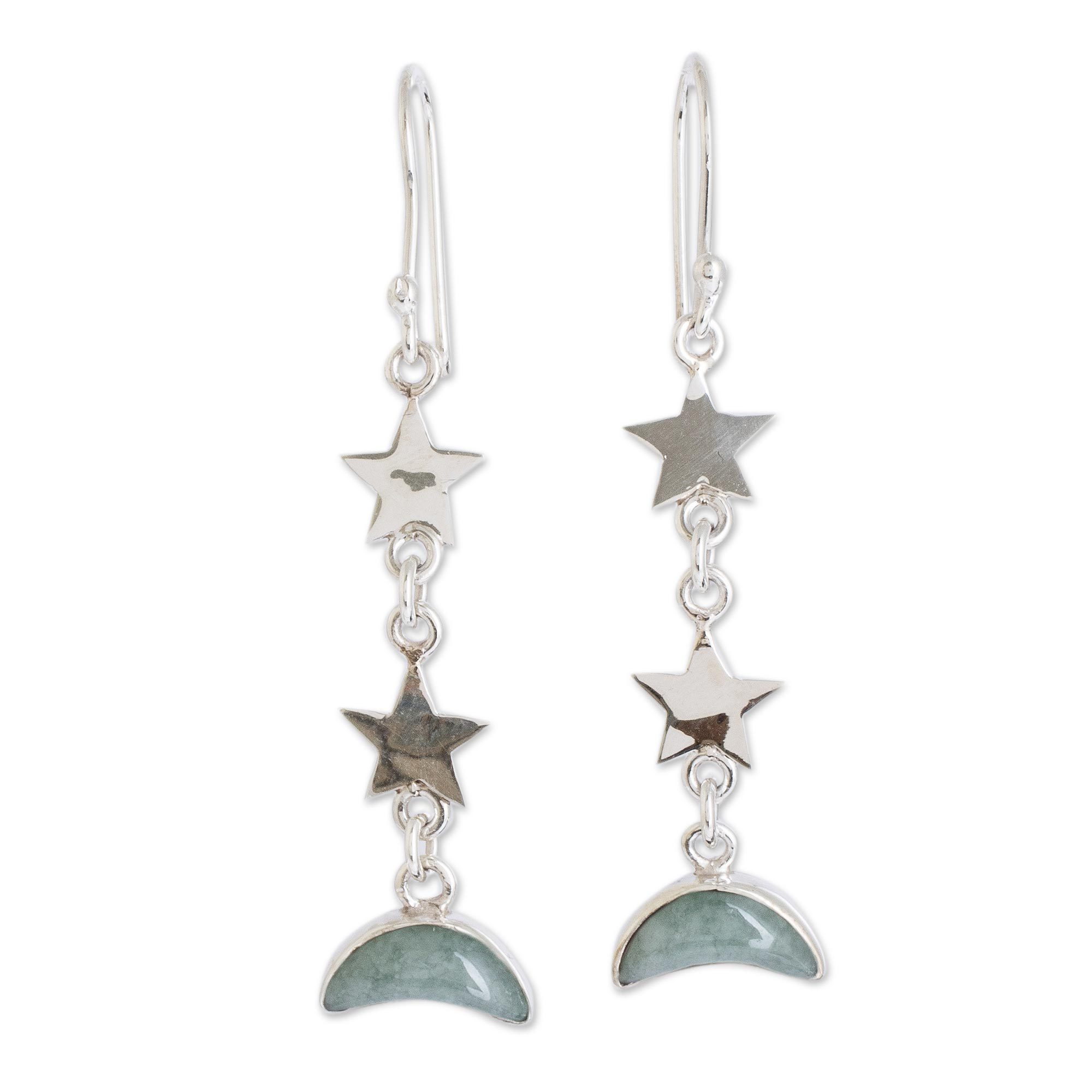 Green Jade Star and Moon Dangle Earrings from Guatemala, 'Starry Nights in Green'