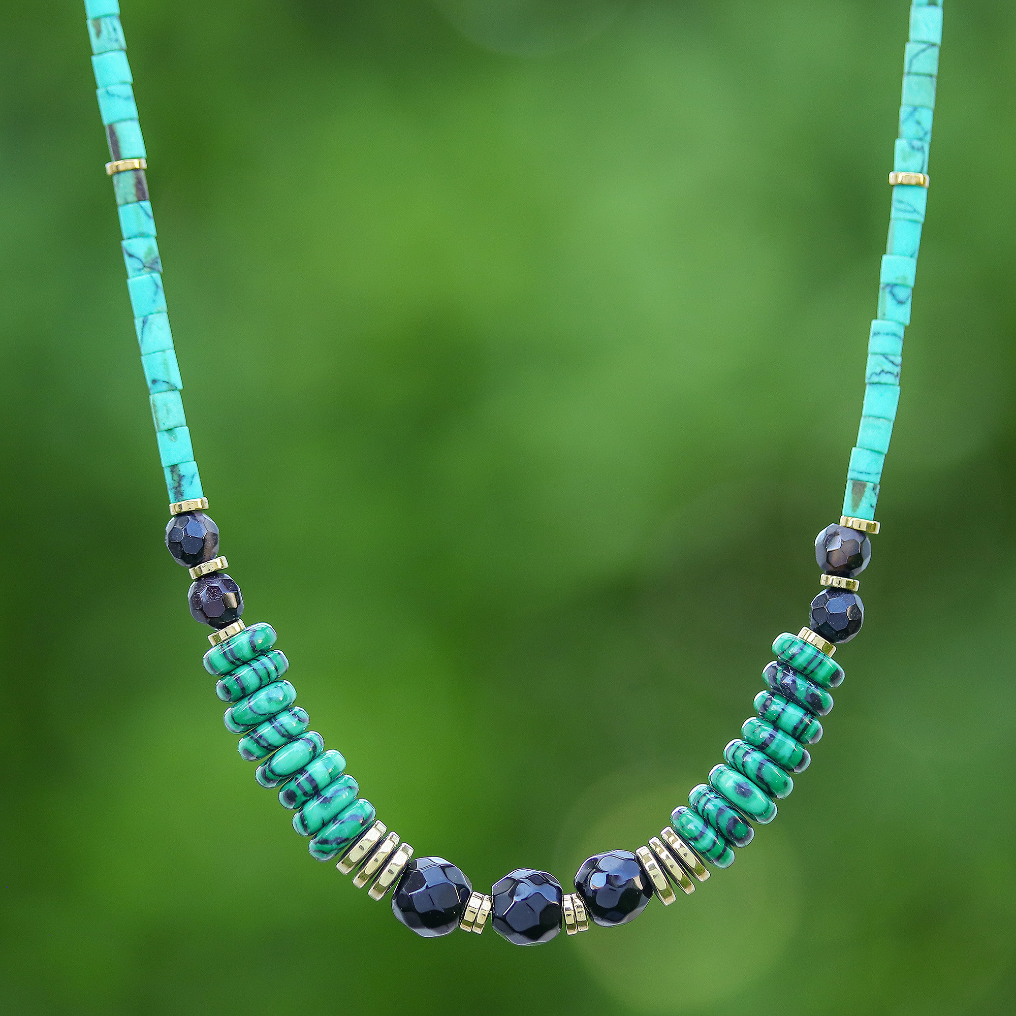 A dream of regality transforms into an ethereal paradise in the hands of artisan Somluck Komolmith from the Thai region. Displaying its gifted vision, Somluck reunites calcite, hematite and chalcedony gems in this beaded choker necklace, whose palette of green hues shines along black and golden accents. A sterling silver spring ring clasp and extender complete the piece with comfort.