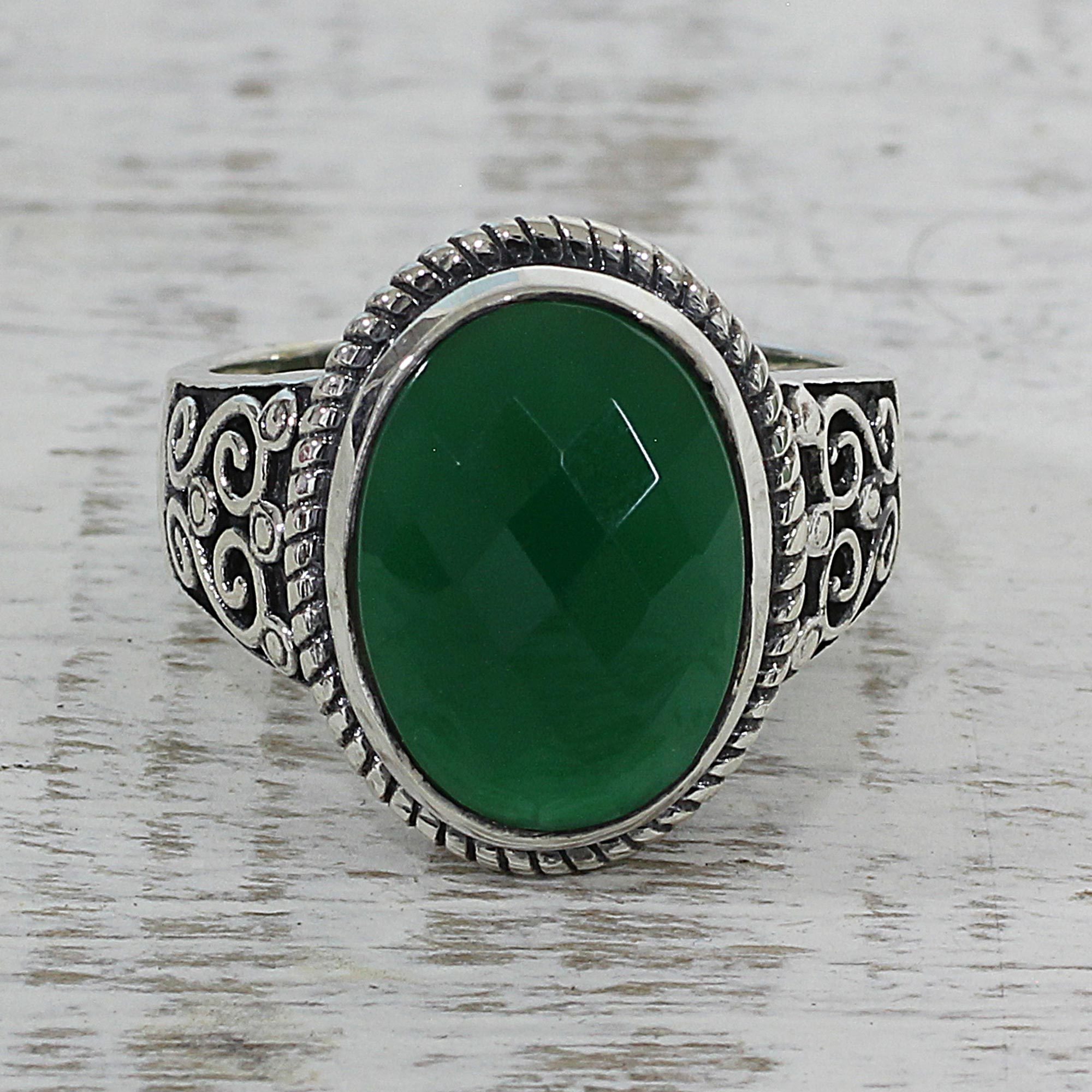 This cocktail ring from India is handcrafted of sterling silver with rope motifs adorning the crown and spirals along the band. Chintan presents the ring, finished with a three-carat stone of luminous dyed green onyx.