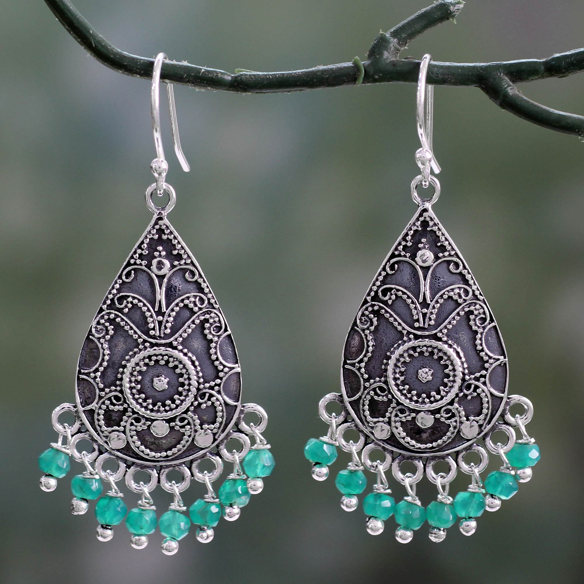 Entrancing beads of green onyx dangle from these unique earrings crafted in India. Chintan's intricate design features delicate fern fronds accented by an oxidized finish.