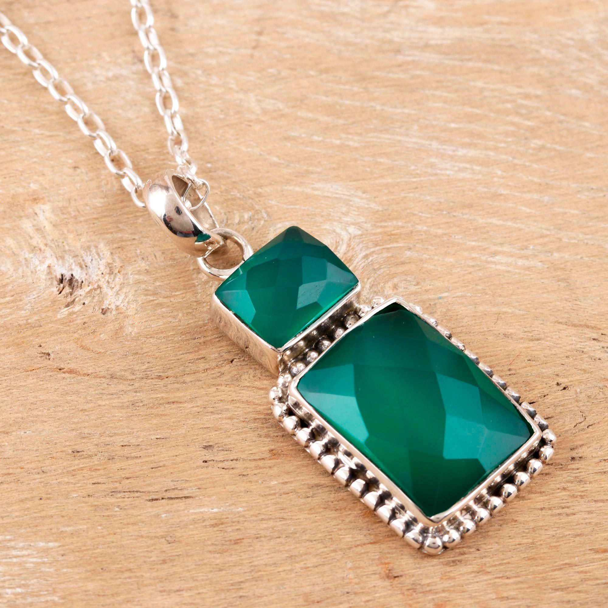 Two green gems glow together on Neeru Goel's enchanting necklace. Indian artisans craft the pendant from two faceted onyx stones--one large, one petite--in sterling silver bezel settings. The shimmering green stones hang from a sterling silver cable chain that fastens with a spring ring clasp.