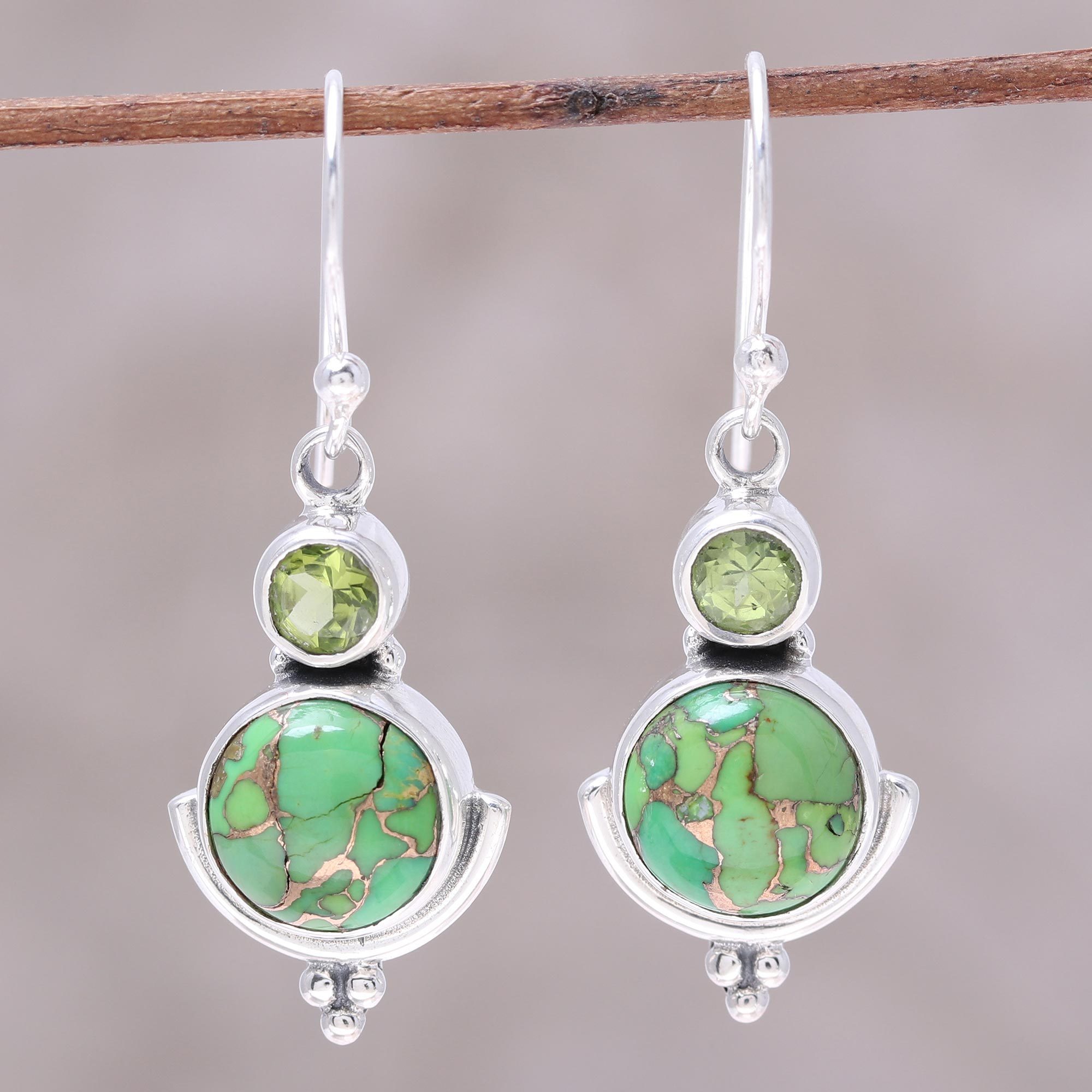One carat of sparkling peridot gemstones sparkles above round stones of green composite turquoise that gleam with golden veins. Neeru Goel presents the earrings, crafted of sterling silver by local artisans.