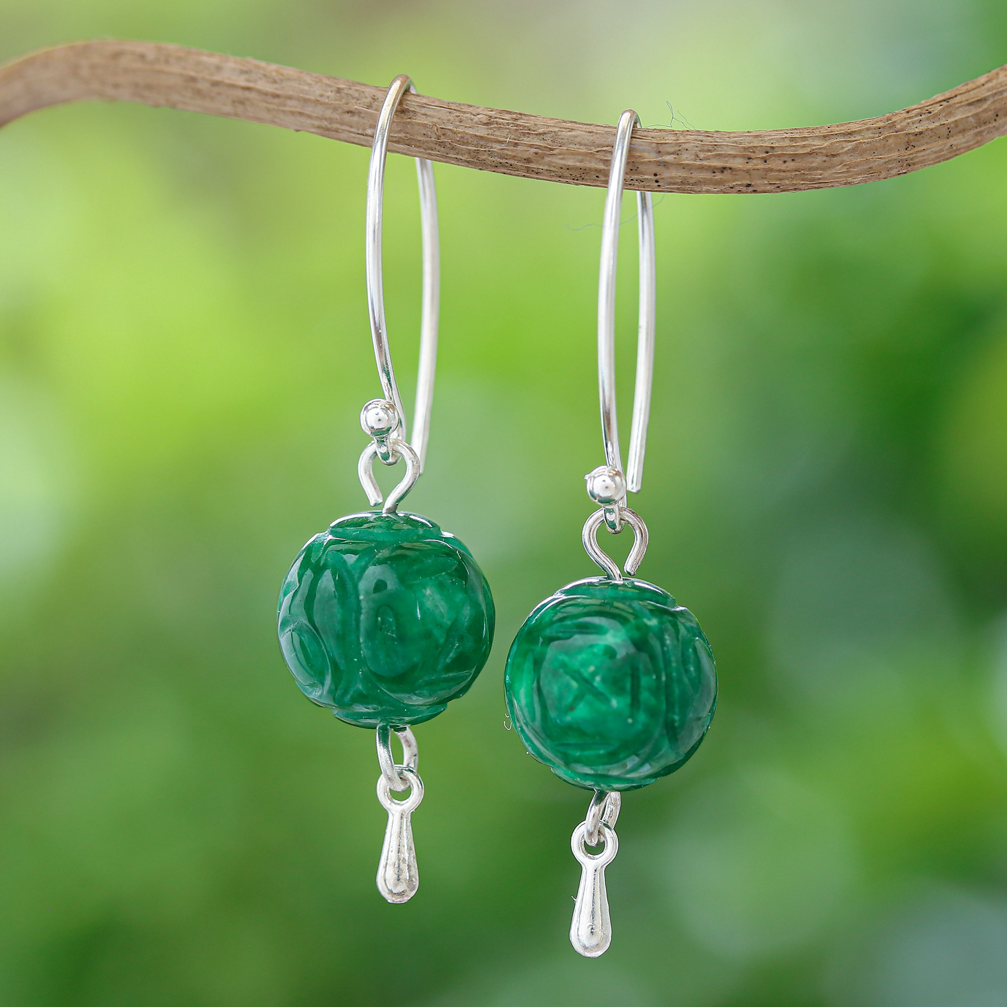 Named after the Thai city of Chiang Mai, these striking dangle earrings feature orbs of green quartz etched with elegant spiral motifs. Matta designs the earrings, hanging them on hooks of sterling silver.