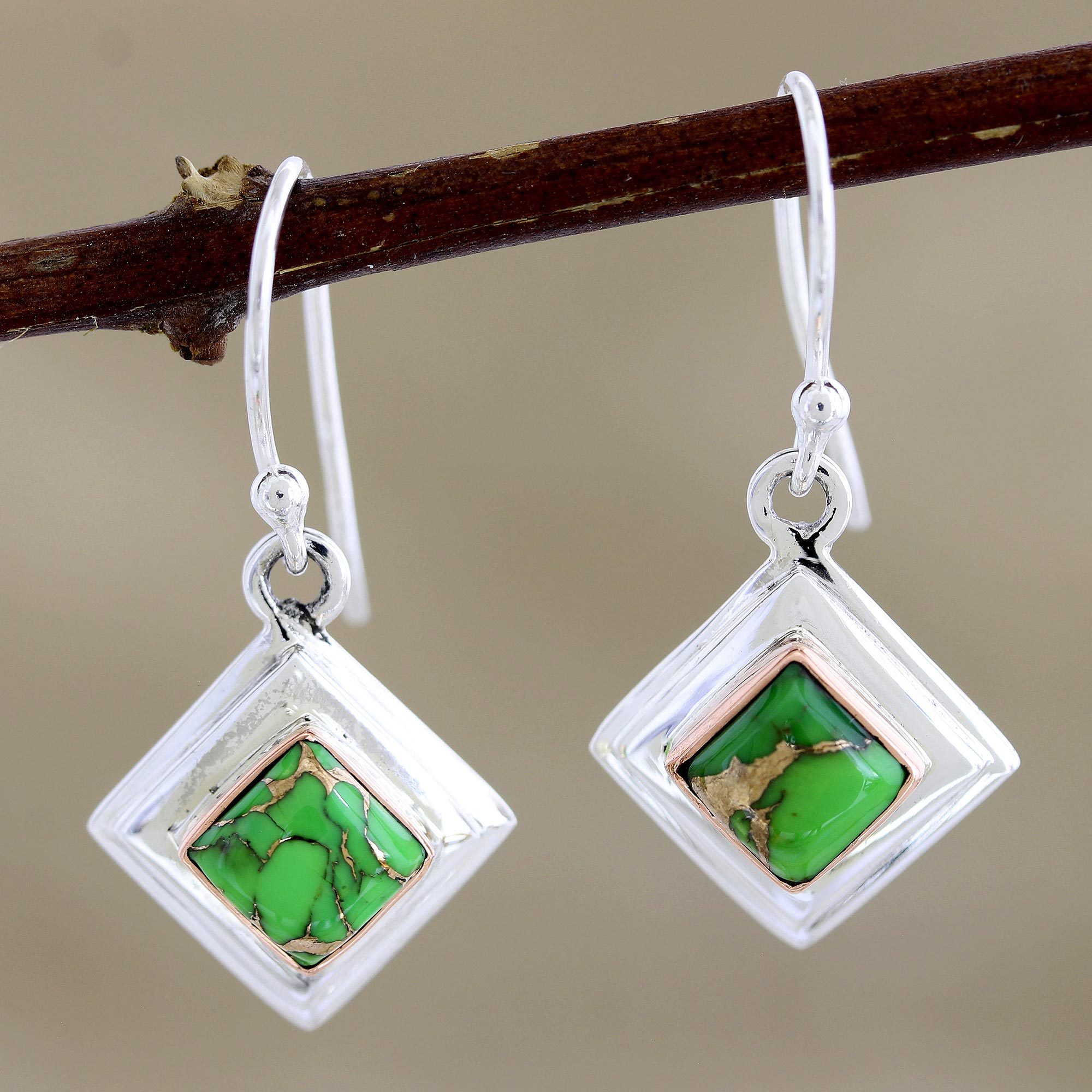 Let twinkling gemstones and cool silver give your ears a colorful upgrade. Presented by Neeru Goel and crafted by Indian artisans, the pair feature a green reconstituted turquoise gemstone framed with a thin copper wire and gleaming sterling silver.