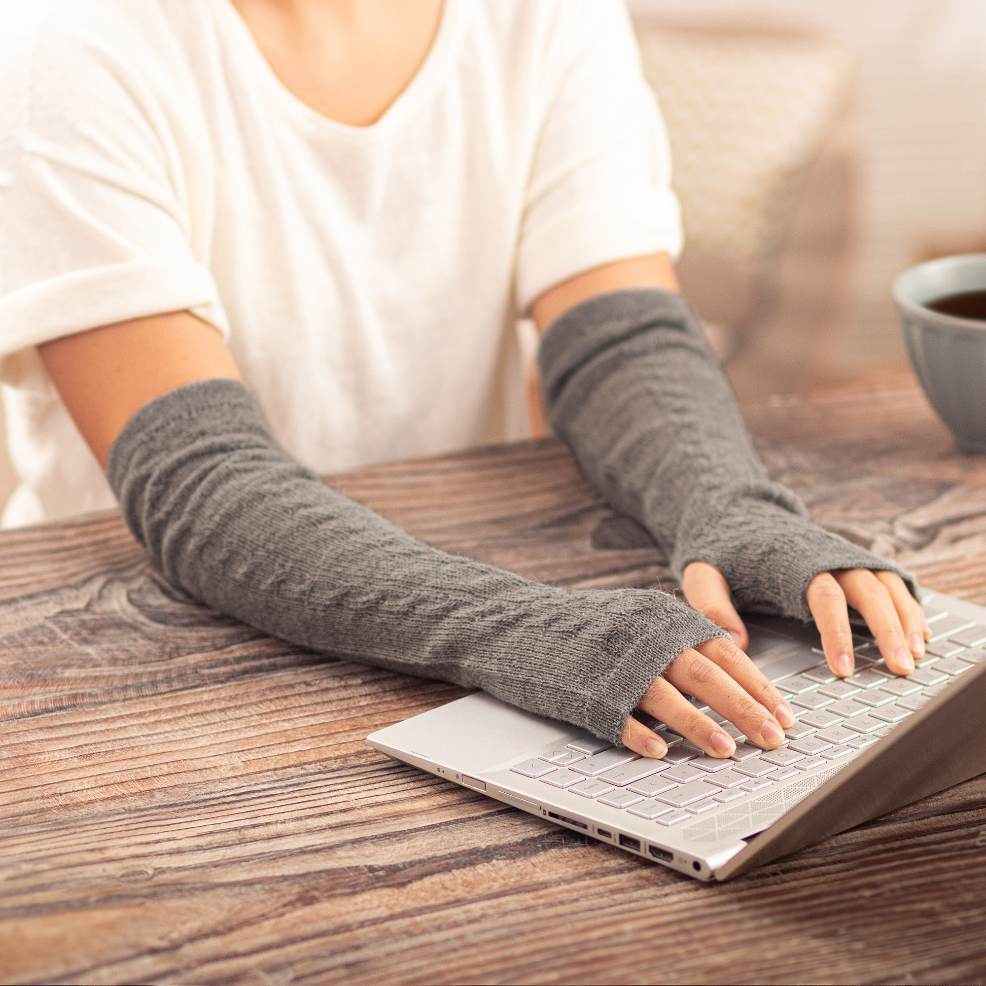 Alfredo Falcon of Peru designs a luxuriously soft pair of long fingerless mitts made of 100% baby alpaca, the fine fleece from the first shearing of the season. In a smoke grey color, the warm and cozy mitts feature a cable knit pattern.
