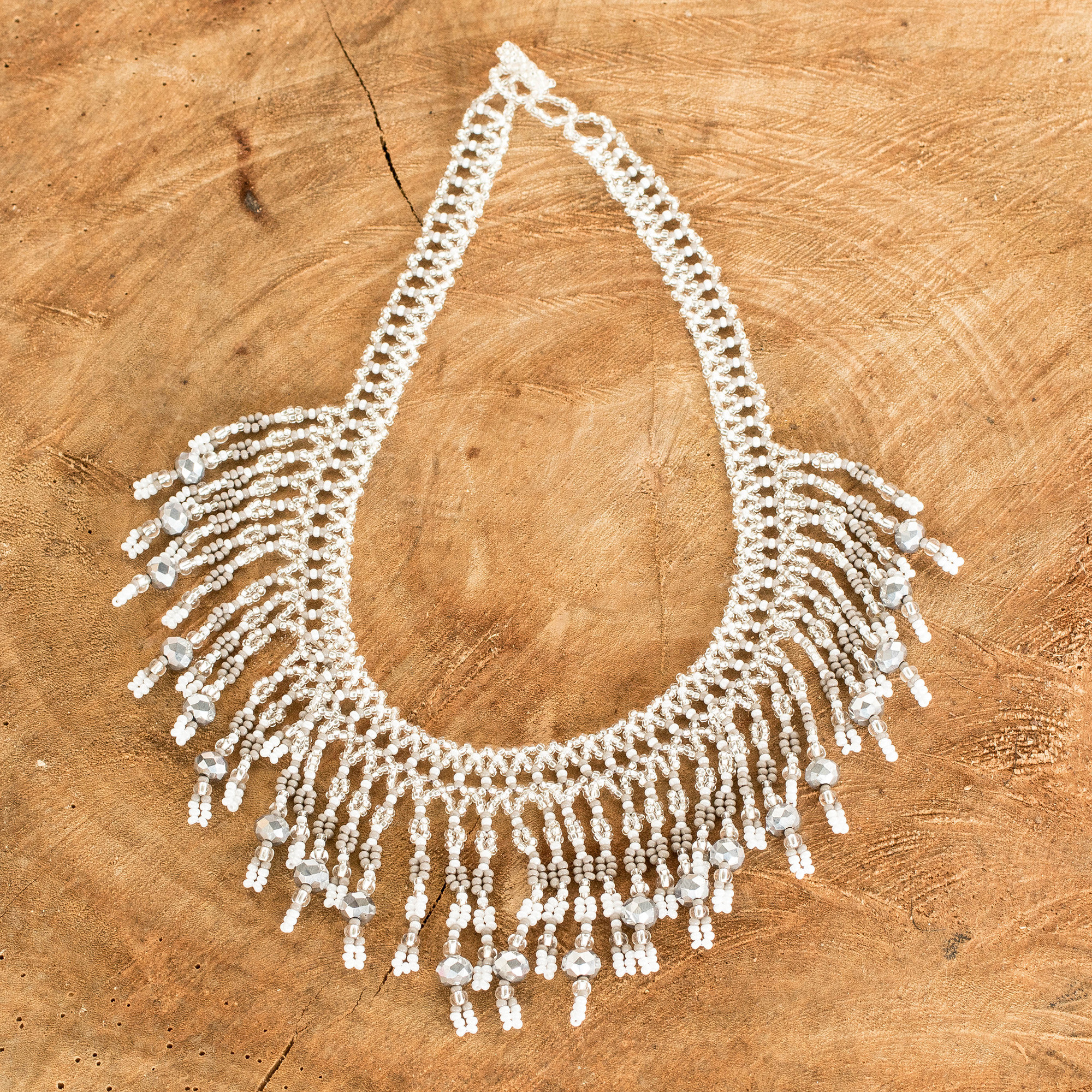 This dramatic beaded waterfall necklace is the original creation of Mirian Zet in Guatemala. The artisan strings grey, clear and white crystal and glass beads in elaborate patterns to create the necklace, which is secured by a beaded toggle clasp.