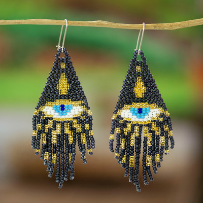 Delicate yet bold, these beaded waterfall earrings combine tradition and artistry with a mesmerizing Turkish eye design. Mexico's Adriana Trejo arranges each tiny glass bead with precision, layering soft greys and vibrant hues into an intricate fringe that sways effortlessly. Finished with lustrous sterling silver hooks, this pair is both symbolic and stylish.