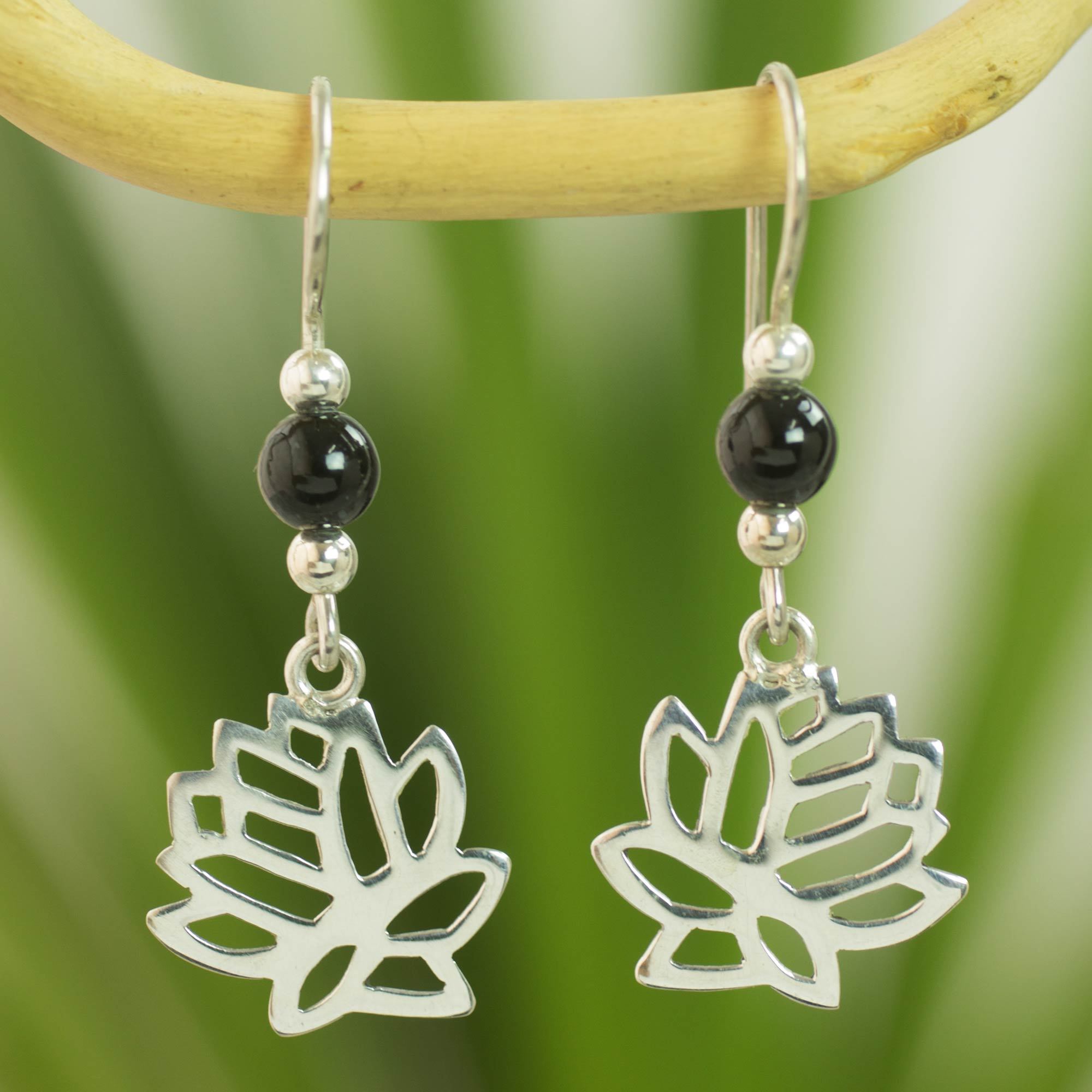 Precious black jade, mined in Guatemala, crowns sterling lotus blossoms. Dancing on silver hooks, the floral silhouettes bring their beauty to Pablo Roquel's handcrafted earrings.