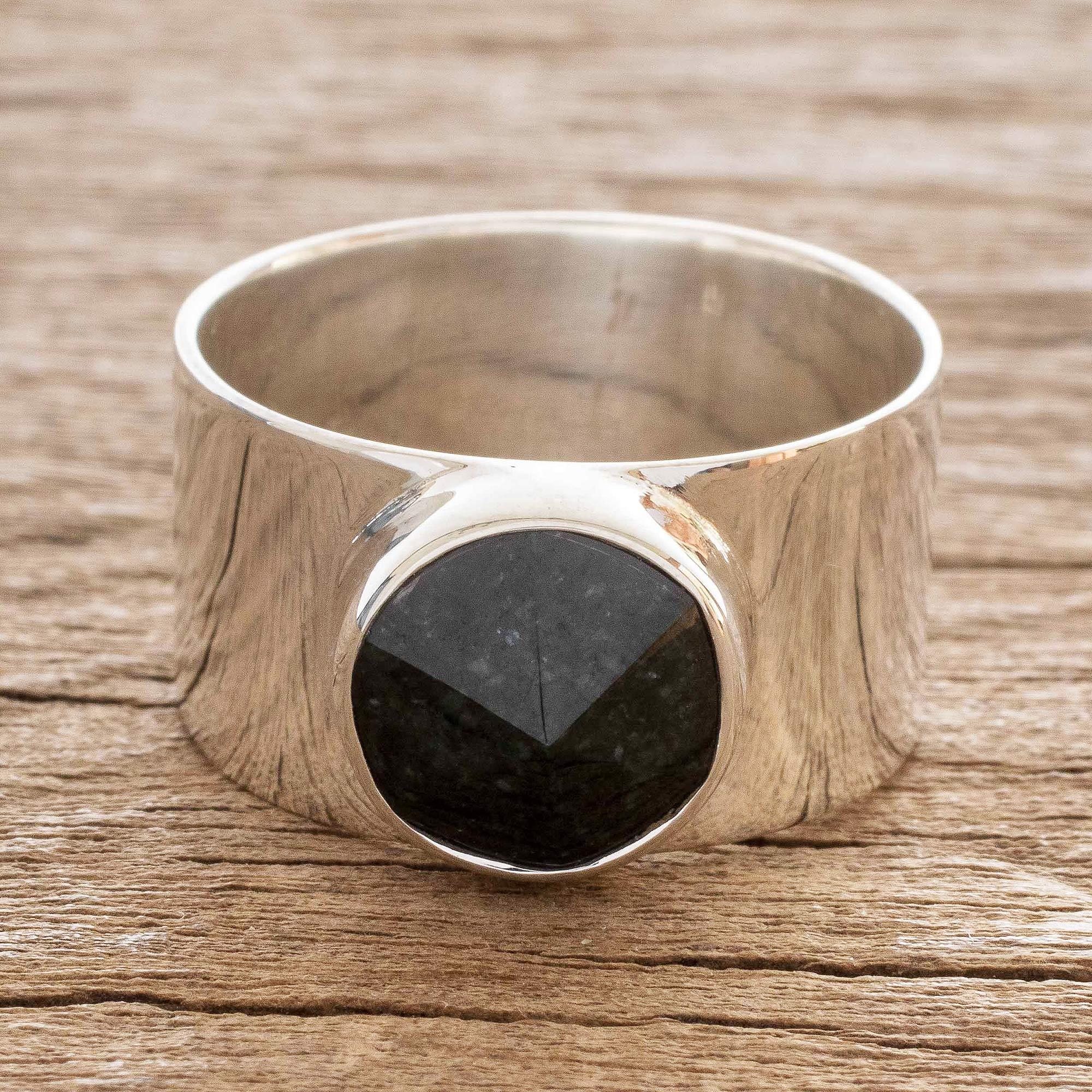 Named for one of the largest active volcanoes in Guatemala, this bold statement ring is presented by the Jimenez Family of Jocotenango. Hand wrought in sterling silver and buffed to a high polish, the broad band features a faceted dome of dark green jade at its center, set within a sterling silver bezel.
