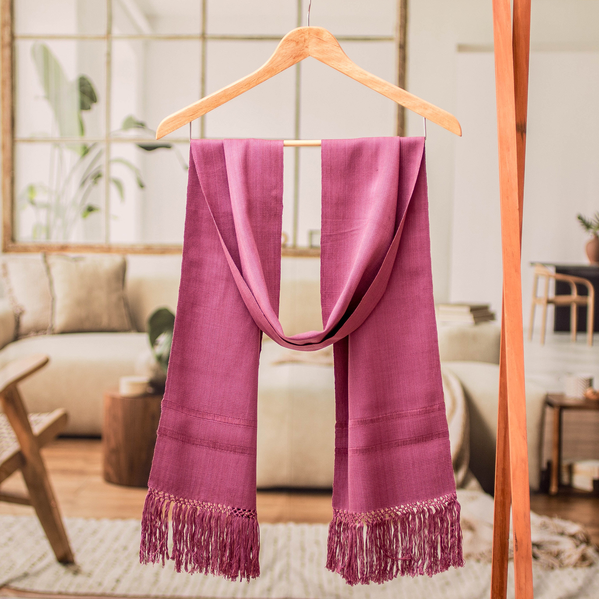 Feel the heartbeat of Guatemalan craftsmanship against your skin with this radiant rayon scarf meticulously hand-woven by the women of the Ranm Ixoqi' group. The smooth, lustrous threads come together in perfect harmony, culminating in a playful fringe that dances at each end. This adaptable accessory that mixes purple and brown yarns is the perfect layering accessory to infuse your look with color and artisanal glamour.