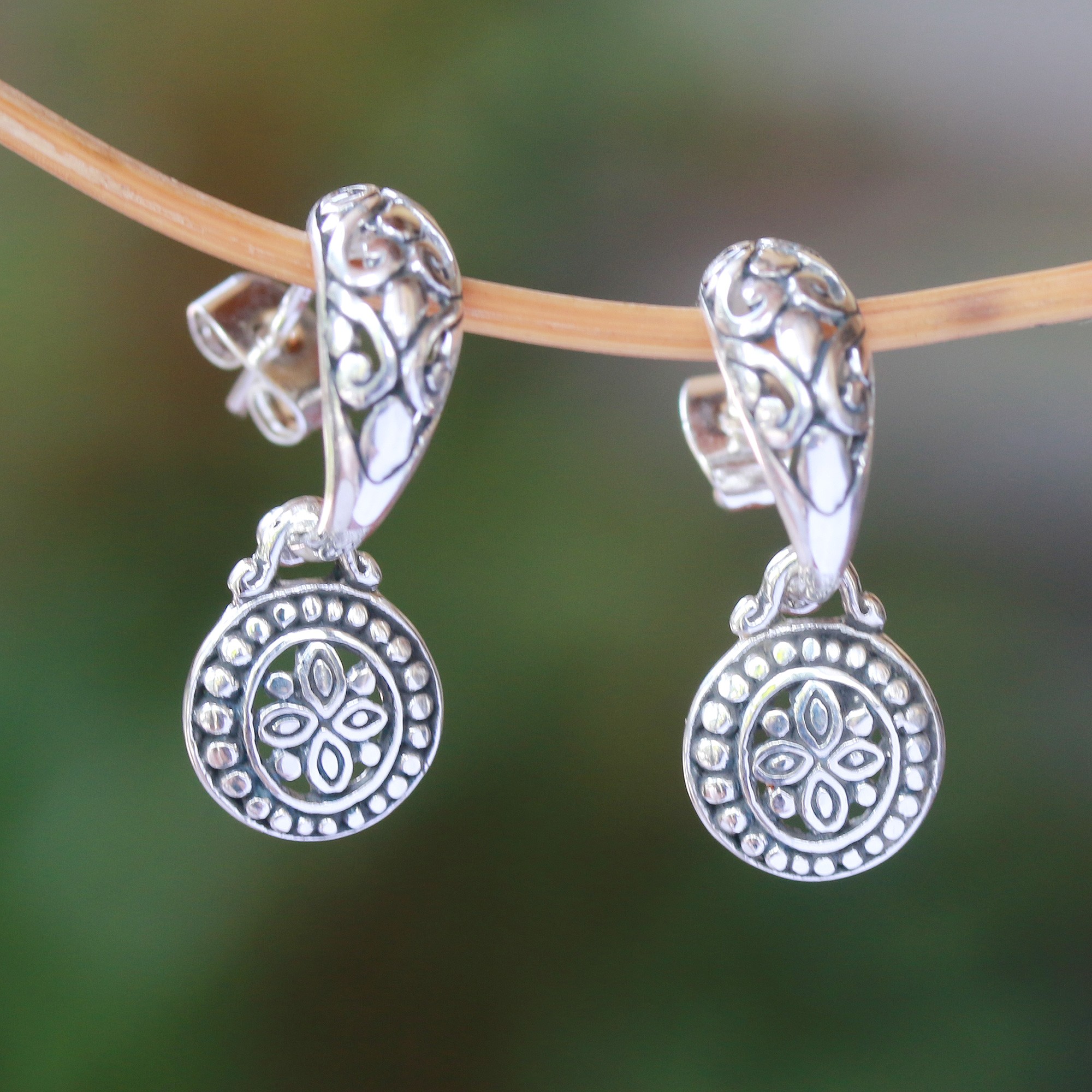 Evoking life, intricate seed and petal patterns decorate two medallions of sterling silver that dangle. Balinese artisan Ari Gunawan creates these earrings, which feature sterling half-hoops detailed with vine patterns. A combination finish accentuates the design of these earrings.